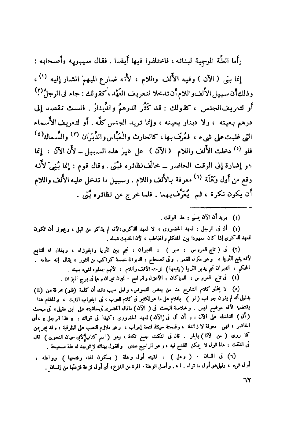 إنما بنى (الآن) وفيه الألف واللام، لأنه ضارع المبهم المشار إليه، وذلك أن سبيل الألف أن تدخلا لتعريف العهد، كقولك: جاءني الرجل أو لتعريف الجنس، كقولك: قد كثر الدرهم والدينار. فلست تقصد إلى درهم بعينه، ولا دينار بعينه، وإنما تريد الجنس كله. أو لتعريف الأسماء التي غلبت على شيء، فعرف بها، كالحارث والعباس والدبران والسماك فلو دخلت الألف واللام (الآن) على غير هذه السبيل- لأن الآن، إنما هو إشارة إلى الوقت الحاضر- خالف نظائره فبنى. وقال قوم: إنما بنى لأنه وقع من أهله معرفة بالألف واللام. وسبيل ما تدخل عليه الألف واللام. وسبيل ما تدخل عليه الألف واللام أن يكون نكرة، ثم يعرف بهما. فلما خرج عن نظائره بنى.