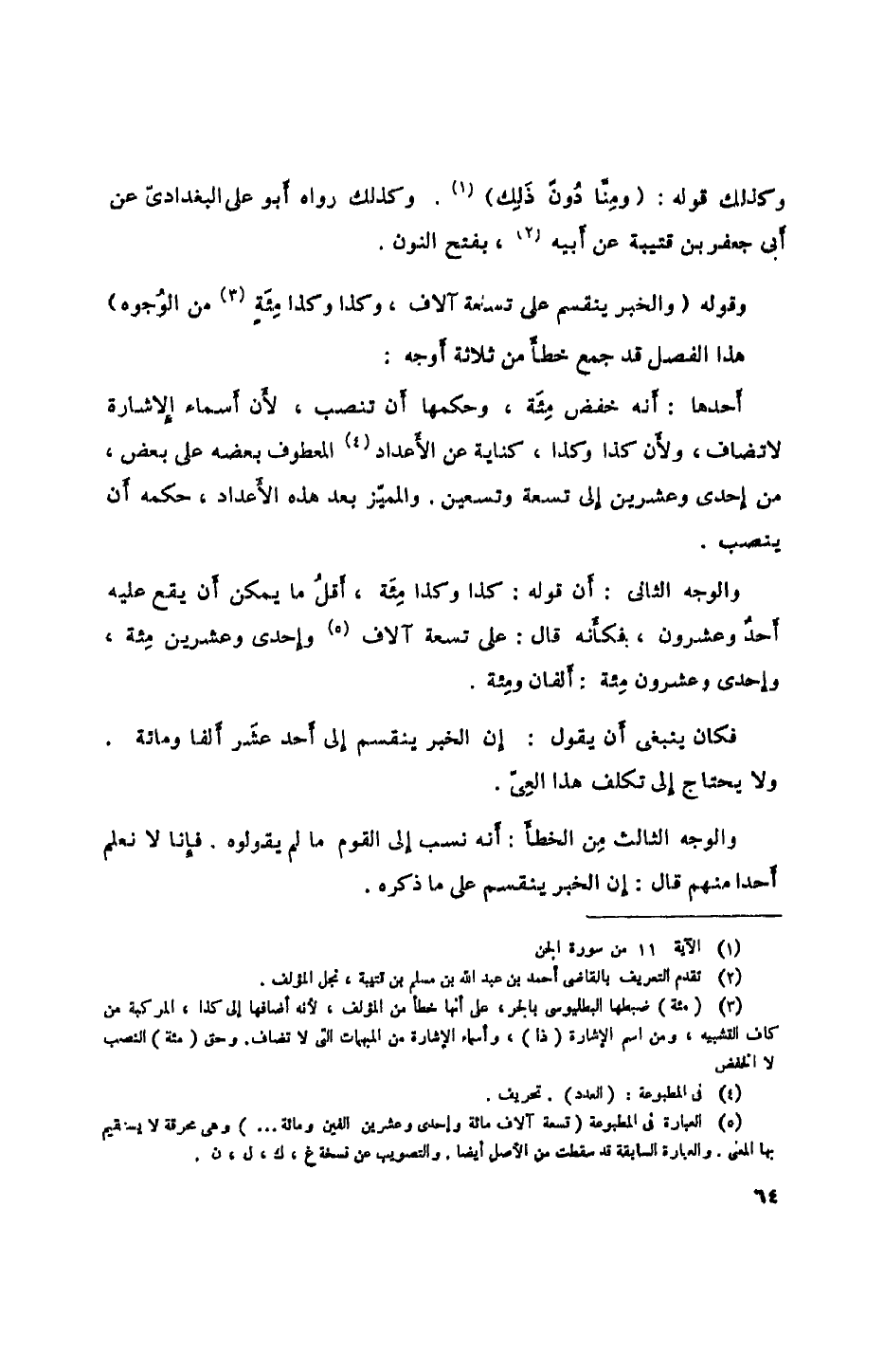 أحدها: أنه خفض مئة، وحكمها أن تنصب، لأن أسماء الإشارة لا تضاف، ولأن كذا وكذا، كناية عن الأعداد المعطوف بعضه على بعض، من إحدى وعشرين إلى تسعة وتسعين. والمميز بعد هذه الأعداد، حكمه أن ينصب.