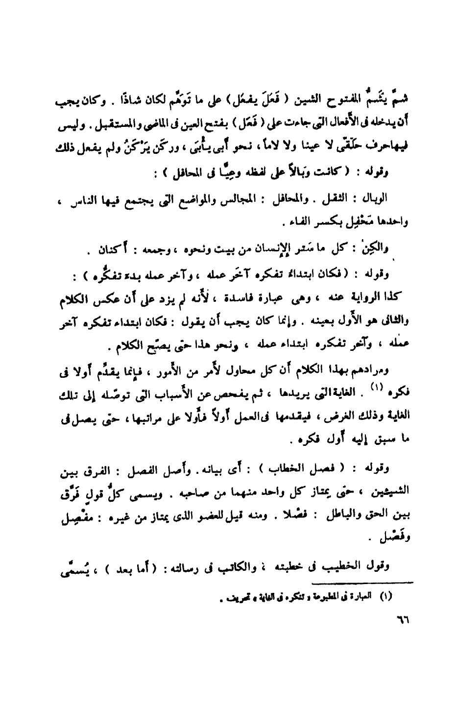 وقوله: (فكان ابتداء تفكره آخر عمله، وآخر عمله بدء تفكره): كذا الرواية عنه، وهي عبارة فاسدة، لأنه لم يزد على أن عكس الكلام والثاني هو الأول بعينه. وإنما كان يجب أن يقول: فكان ابتداء تفكره آخر عمله، وآخر تفكره ابتداء عمله، ونحو هذا حتى يصبح الكلام.