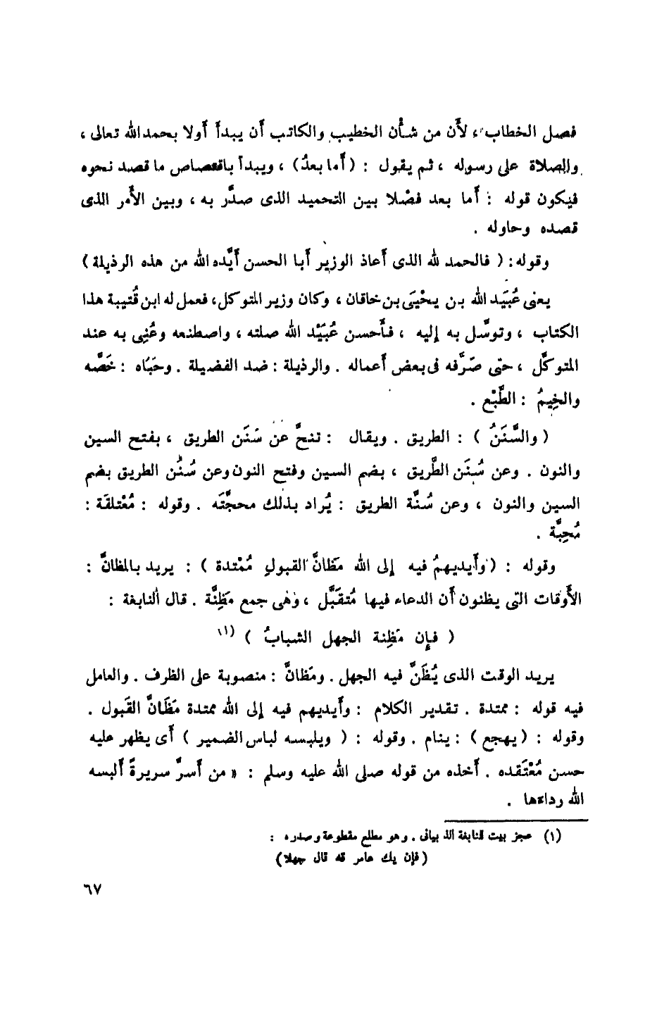 وقوله: (فالحمد لله الذي أعاذ الوزير أبا الحسن أيده الله من هذه الرذيلة) يعني عبيد الله بن يحيي بن خاقان، وكان وزير المتوكل، فعمل له ابن قتيبة هذا الكتاب، وتوسل به إليه، فأحسن عبيد الله صلته، واصطنعه وعنى به عند المتوكل، حتى صرفه في بعض أعماله. والرذيلة: ضد الفضيلة. وحباه: خصه والخيم: الطبع.