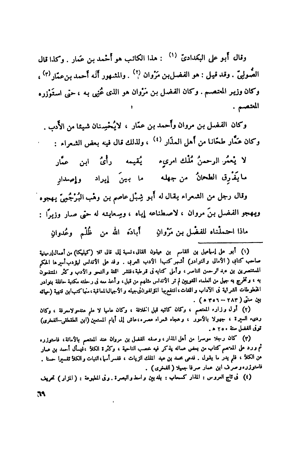 وكان الفضل بن مروان وأحمد بن عمار، لا يحسنان شيئاً من الأدب. وكان عمار طحاناً من أهل المذار، ولذلك قال فيه بعض الشعراء: