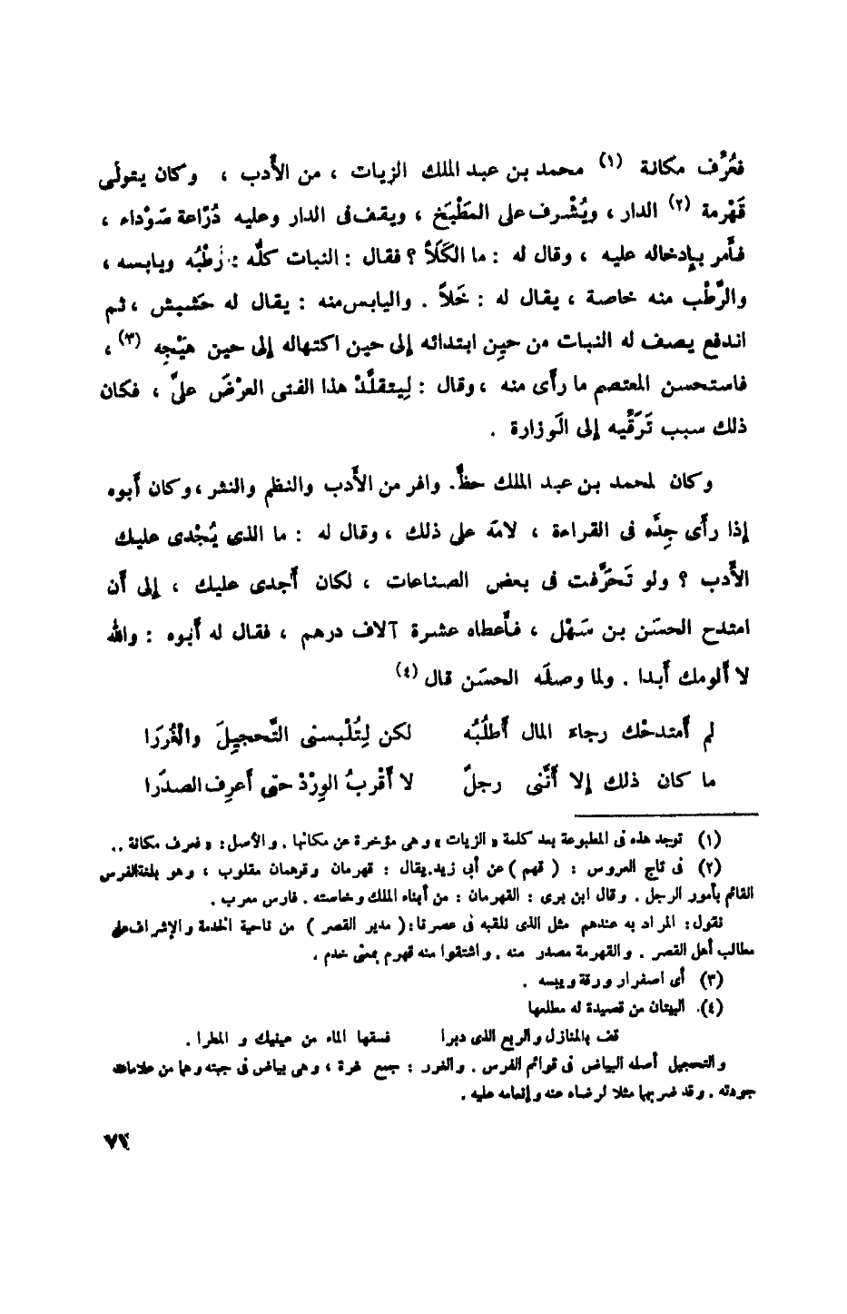 فعرف مكانة محمد بن عبد الملك الزيات، من الأدب، وكان يتولى قهرمة الدار، ويشرف على المطبخ، ويقف في الدار وعليه دراعة سوداء، فأمر بإدخاله عليه، وقال له: ما الكلأ؟ فقال: النبات كله رطبه ويابسة، والرطب منه خاصة، يقال له: خلا. واليابس منه: يقال له حشبش، ثم اندفع يصف له النبات من حين ابتدائه إلى حين اكتهاله إلى حين هيجه، فاستحسن المعتصم ما رأى منه، وقال: ليتقلد هذا الفتى العرض على، فكان ذلك سبب ترقيه إلى الوزارة.
