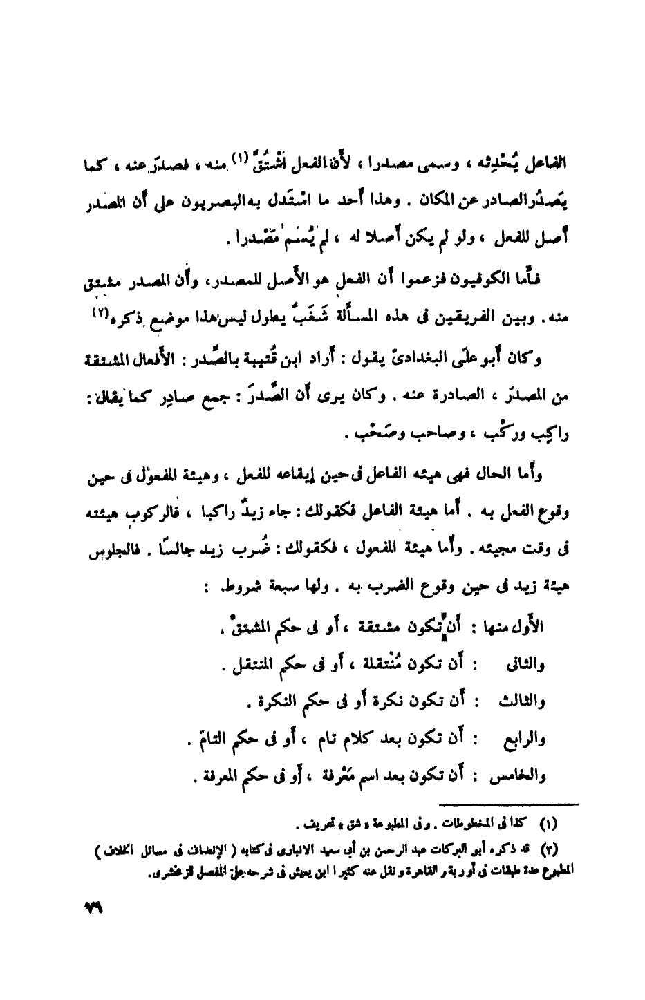 وكان أبو علي البغدادي يقول: أرد ابن قتيبة بالصدر: الأفعال المشتقة من المصدر، الصادرة عنه. وكان يرى أن الصدر: جمع صادر كما يقال: راكب وركب، وصاحب وصحب.