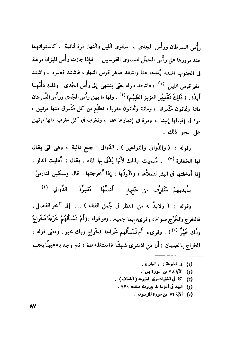 رأس السرطان ورأس الجدي. استوي الليل والنهار مرة ثانية. كاستوائهما عند مرورها على رأس الحمل لتساوي القوسين. فإذا جازت رأس الميزان موغلة في الجنوب اشتد بعدها عنا واشتد صغر قوس النهار، فاشتد قصره. واشتد عظم قوس الليل، فاشتد طوله حتى ينتهي إلى رأس الجدي. وذلك دأبهما أبداً. {ذَلِكَ تَقْدِيُر العَزيز العَلِيْم}. ولها ما بين رأس الجدي ورأس السرطان مائة وثمانون مشرقاً. ومائة وثمانون مغرباً، تطلع من كل مشرق منها مرتين، مرة في إقبالها إلينا، ومرة في إدبارها عنا، وتغرب في كل مغرب منها مرتين على نحو ذلك.