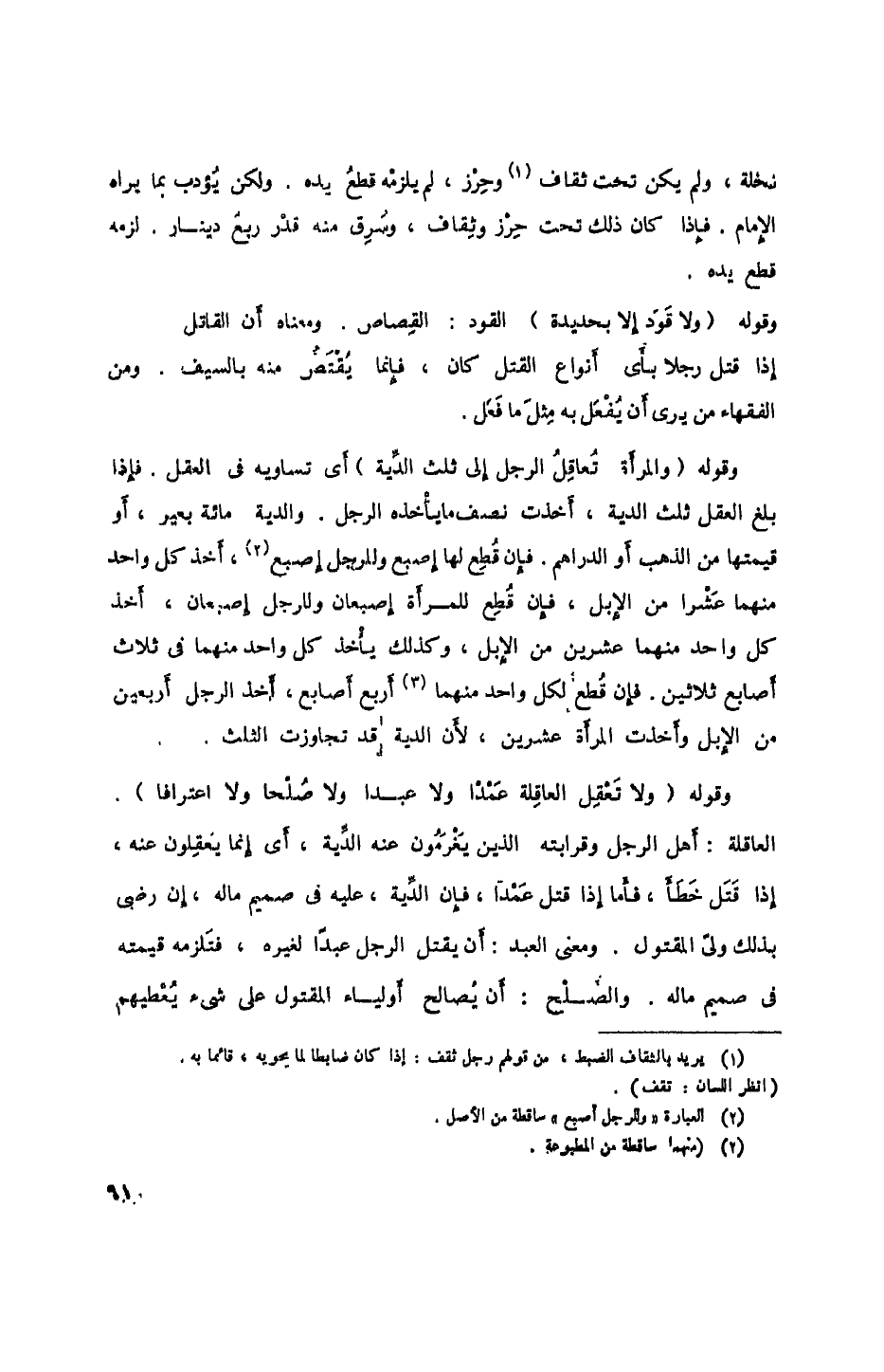 وقوله (والمرأة تعاقل الرجل إلى ثلث الدية) أي تساويه في العقل. فإذا بلغ العقل ثلث الدية، أخذت نصف ما يأخذه الرجل. والدية مائة بعير، أو قيمتها من الذهب أو الدراهم. فإن قطع لها إصبع وللرجل إصبع، أخذ كل واحد منهما عشراً من الإبل، فإن قطع للمرأة إصبعان وللرجل إصبعان، أخذ كل منهما عشرين من الإبل، وكذلك يأخذ كل واحد منهما في ثلاث أصابع ثلاثين. فإن قطع كل واحد منهما أربع أصابع، أخذ الرجل أربعين من الإبل وأخذت المرأة عشرين، لأن الدية قد تجاوزت الثلث.