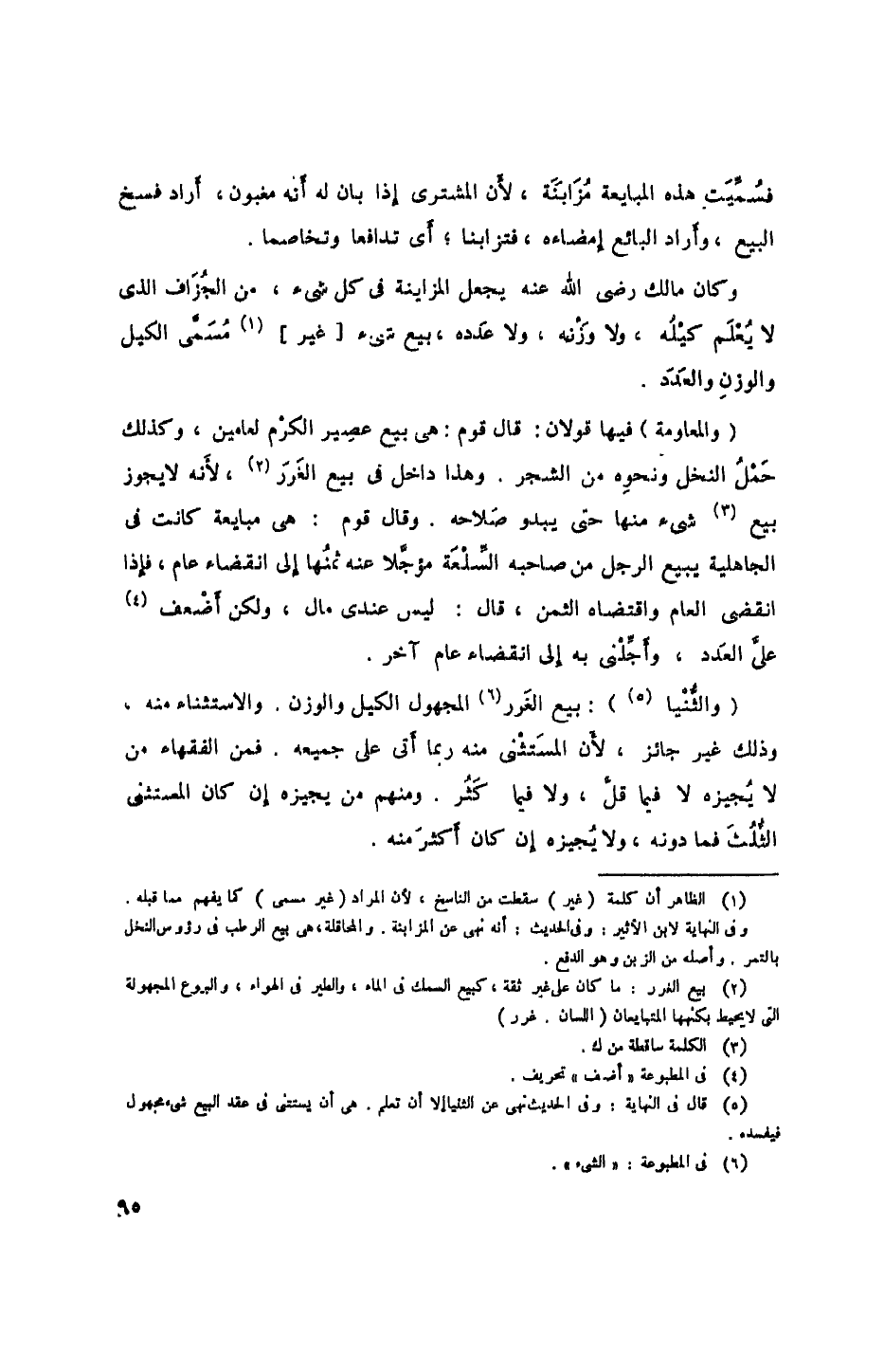 (والثنيا): بيع الغرر المجهول الكيل والوزن. والاستثناء منه، وذلك غير جائز، لأن المستثنى منه ربما أتى على جميعه. فمن الفقهاء من لا يجيزه لا فيما قل، ولا فيما كثر. ومنهم من يجيزه إن كان المستثنى الثلث فما دونه، ولا يجيزه إن كان أكثر منه.