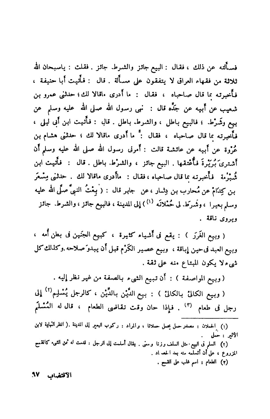 فسألته عن ذلك، فقال: البيع جائز والشرط جائز. فقلت: يا سبحان الله ثلاثة من فقهاء العراق لا يتفقون على مسألة. قال: فأتيت أبا حنيفة، فأخبرته بما قال صاحباه، فقال: ما أدري ما قالا لك، حدثني عمرو بن شعيب عن أبيه عن جده قال: نهى رسول الله صلى الله عليه وسلم عن بيع وشرط، فالبيع باطل، والشرط باطل. قال: فأتيت ابن أبي ليلى، فأخبرته بما قال صاحباه، فقال: ما أدري ما قالا لك، حدثني هشام بن عروة عن أبيه عن عائشة قالت: أمرني رسول الله صلى الله عليه وسلم أن أشترى بريرة فأعتقها. البيع جائز، والشرط باطل. قال: فأتيت ابن شبرمة فأخبرته بما قال صاحباه، فقال: ما أدري ما قالا لك. حدثني مسعر بن كدام عن محارب بن دثار، عن جابر قال: (بعث النبي صلى الله عليه وسلم بعيرا، وشرط لي حملانه) إلى المدينة، فالبيع جائز، والشرط جائز ويروي ناقة.