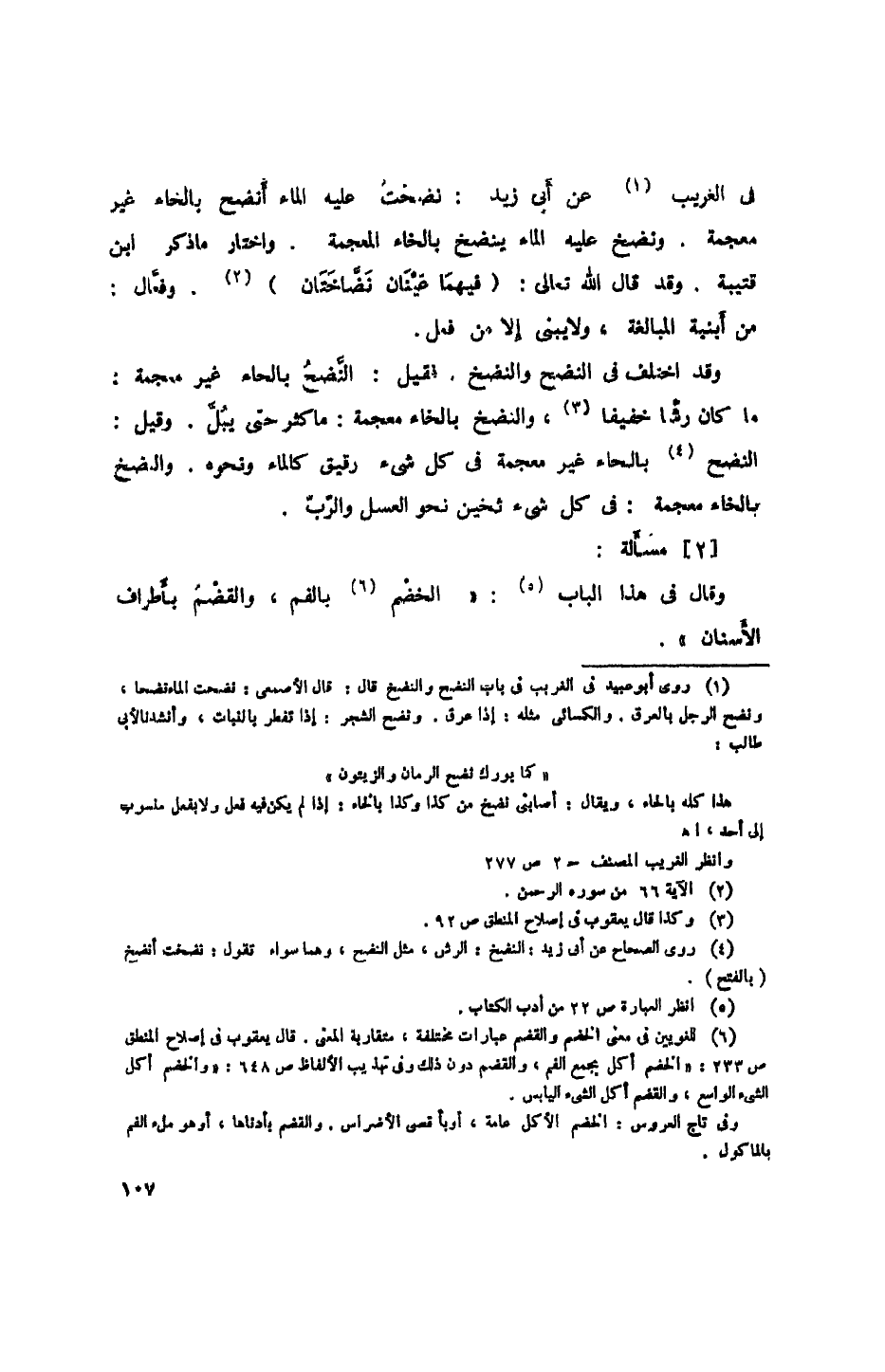 في الغريب عن أبي زيد: نضحت عليه الماء أنضح بالخاء غير معجمة. ونضخ عليه الماء ينضخ بالخاء المعجمة. واختار ما ذكر ابن قتيبة، وقد قال الله تعالى: (فيهما عينان نضاختان). فعال: من أبنية المبالغة، ولا يبنى إلا من فعل.