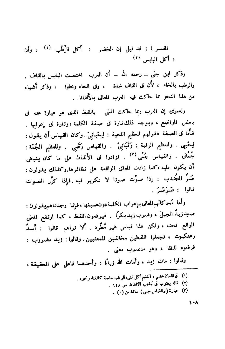 ولعمري إن العرب ربما حاكت المعنى باللفظ الذي هو عبارة عنه في بعض المواضع، ويوجد ذلك تارة في صفة الكلمة، وتارة في إعرابها. فأما في الصفة فقولهم للعظيم اللحية: لحياني. وكان القياس أن يقول: لحيي. وللعظيم الرقبة: رقباني. والقياس رقبي. وللعظيم الجمة: جماني. والقياس جمي. فزادوا في الألفاظ على ما كان ينبغي أن يكون عليه، كما زادت المعاني الواقعة على نظائرها. وكذلك يقولون: صر الجندب: إذا صوت صوتاً لا تكرير فيه. فإذا كرر الصوت قالوا: صرصر.