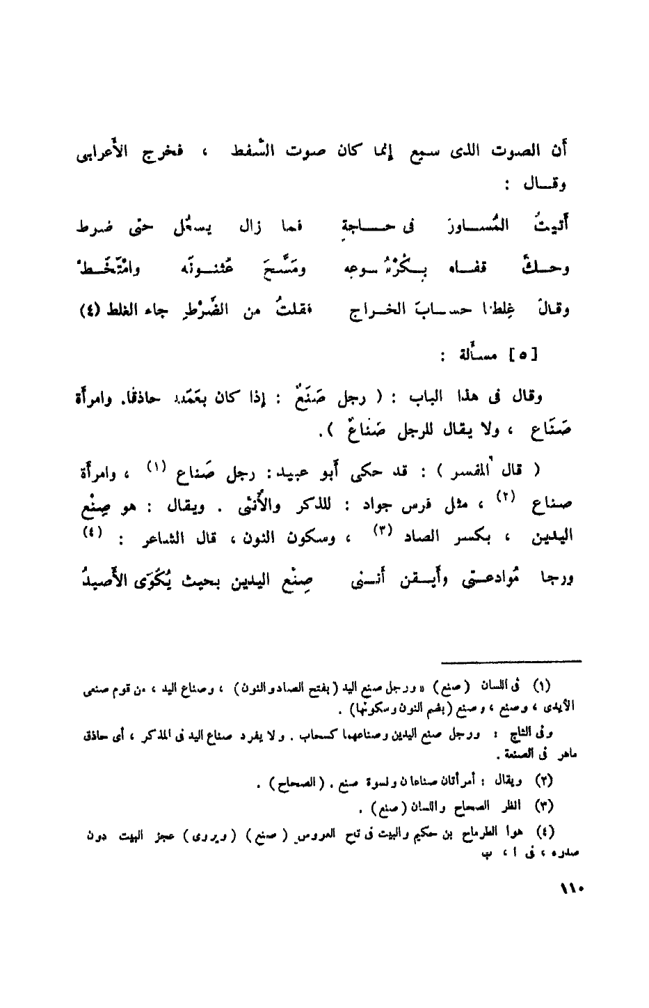 (قال المفسر): قد حكى أبو عبيد: رجل صناع، وامرأة صناع، مثل فرس جواد: للذكر والأنثى. ويقال: هو صنع اليدين، بكسر الصاد، وسكون النون، قال الشاعر: