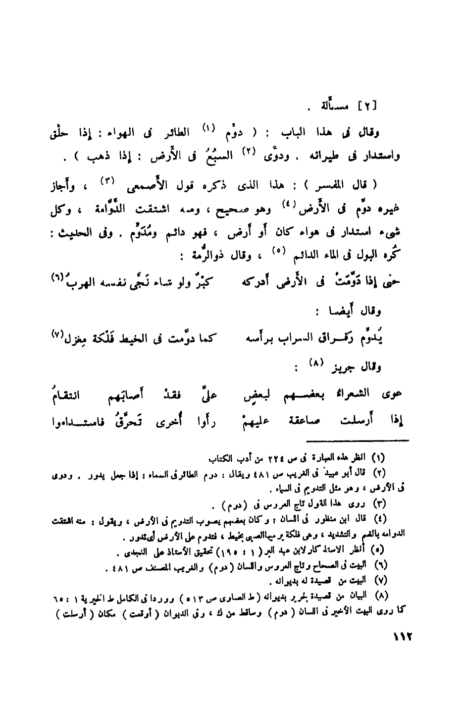 (قال المفسر): هذا الذي ذكره قول الأصمعي، وأجاز غيره دوم في الأرض وهو صحيح، ومنه اشتقت الدوامة، وكل شيء استدار في هواء كان أو أرضن فهو دائم ومدوم. وفي الحديث: كره البول في الماء الدائم، وقال ذو الرمة: