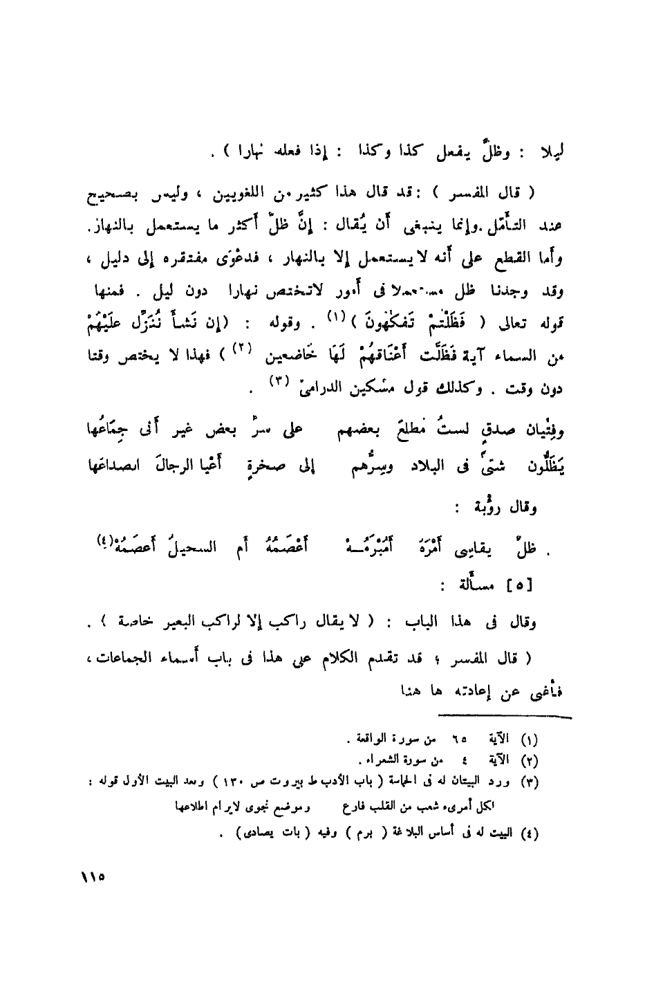 (قال المفسر): قد قال هذا كثير من اللغويين، وليس بصحيح عند التأمل. وإنما ينبغي أن يُقال: إن ظل أكثر ما يستعمل بالنهار. وأما القطع على أنه لا يستعمل إلا بالنهار، فدعوى مفتقره إلى دليل، وقد وجدنا ظل مستعملاً في أمور لا تختص نهاراً دون ليل. فمنها قوله تعالى (فظلتم تفكهون). وقوله: (إن نشأ ننزل عليهم من السماء آية فظلت أعناقهم لها خاضعين) فهذا لا يختص وقتاً دون وقت، وكذلك قول مسكين الدرامي.