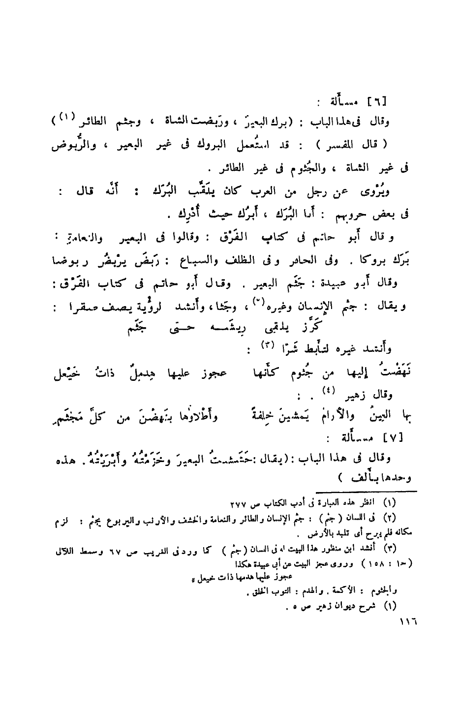 وقال في هذا الباب: (برك البعير، وربضت الشاة، وجثم الطائر).