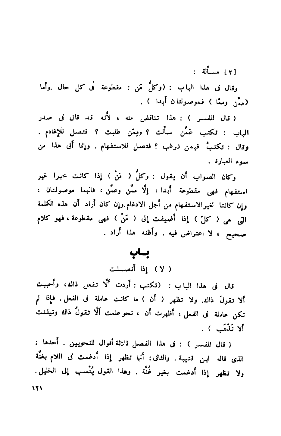 (قال المفسر): هذا تناقض منه، لأنه قد قال في صدر الباب: تكتب فيمن ترغب؟ فتصل للاستفهام. وإنما أتى هذا من سوء العبارة.