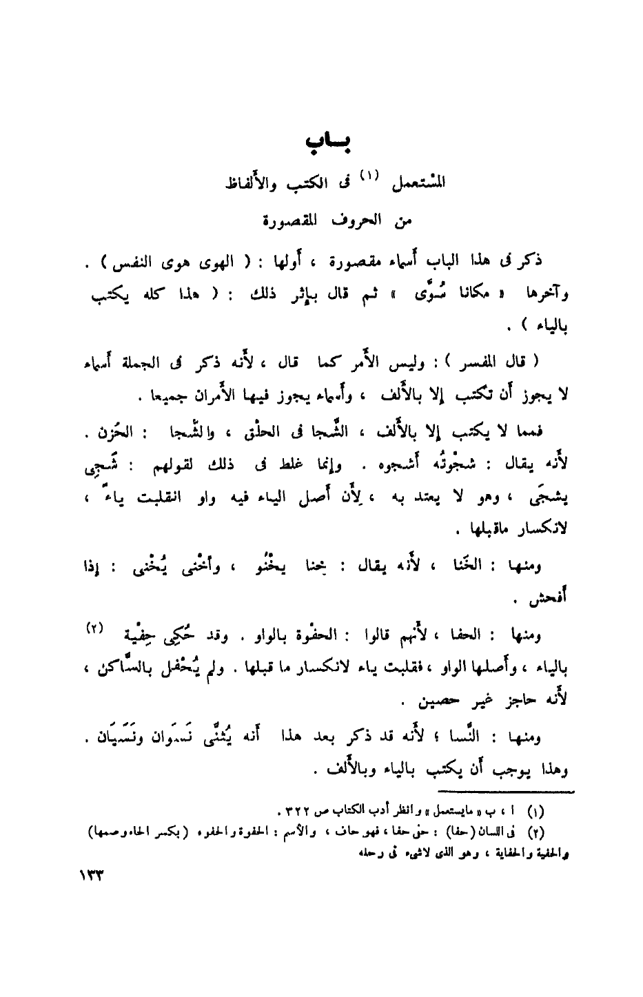 ذكر في هذا الباب أسماء مقصورة، أولها: (الهوى هوى النفس). وآخرها "مكاناً سوى" ثم قال بإثر ذلك: (هذا كله يكتب بالياء).