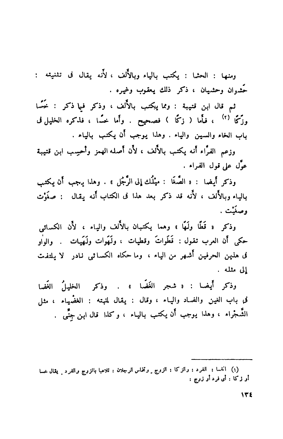 ثم قال ابن قتيبة ومما يكتب بالألف، وذكر فيما ذكر: خسا وزكا، فأما (زكا) فصحيح. وأما خسا، فذكره الخليل في باب الخاء والسين والياء. وهذا يوجب أن يكتب بالياء.
