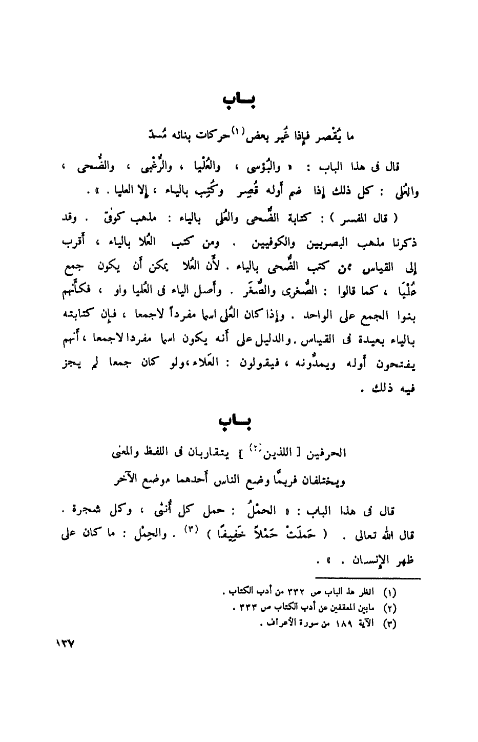(قال المفسر): كتابة الضحى والعُلى بالياء: مذهب كوفي. وقد ذكرنا مذهب البصريين والكوفيين. ومن كتب العلا بالياء، أقرب إلى القياس ممن كتب الضحى بالياء. لأن العُلا يمكن أن يكون جمع عليا، كما قالوا: الصغرى والصغر. وأصل الياء في العليا واو، فكأنهم بنوا الجمع على الواحد. وإذا كان العلى اسما مفرداً لا جمعا، فإن كتابته بالياء بعيدة في القياس. والدليل على أنه يكون اسماً مفرداً لا جمعاً، أنهم يفتحون أوله ويمدونه، فيقولون: العلاء، ولو كان جمعاً لم يجز فيه ذلك.