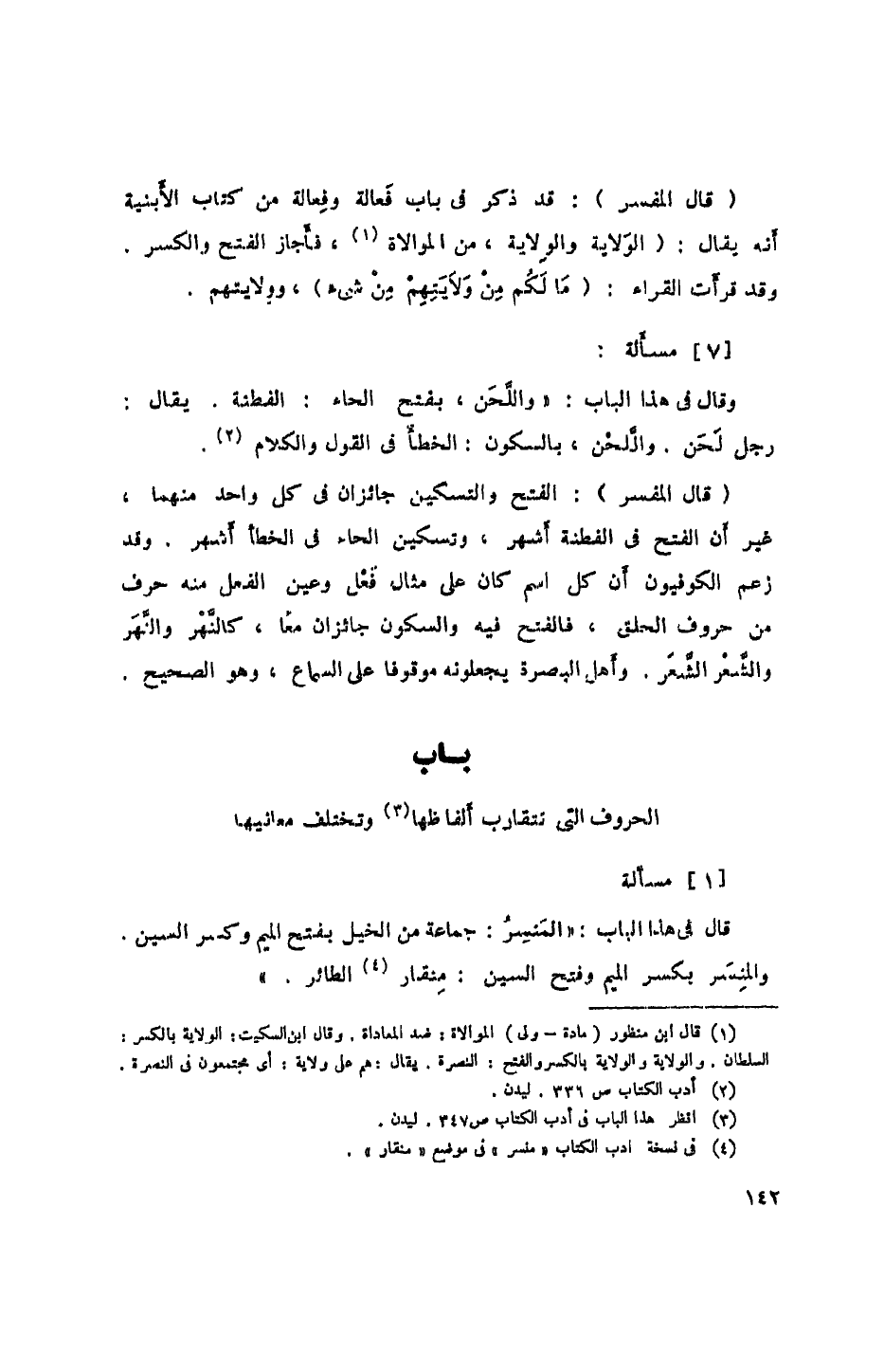وقال في هذا الباب: "واللحن، بفتح الحاء: الفطنة. يقال: رجل لحن، واللحن، بالسكون: الخطأ في القول والكلام.