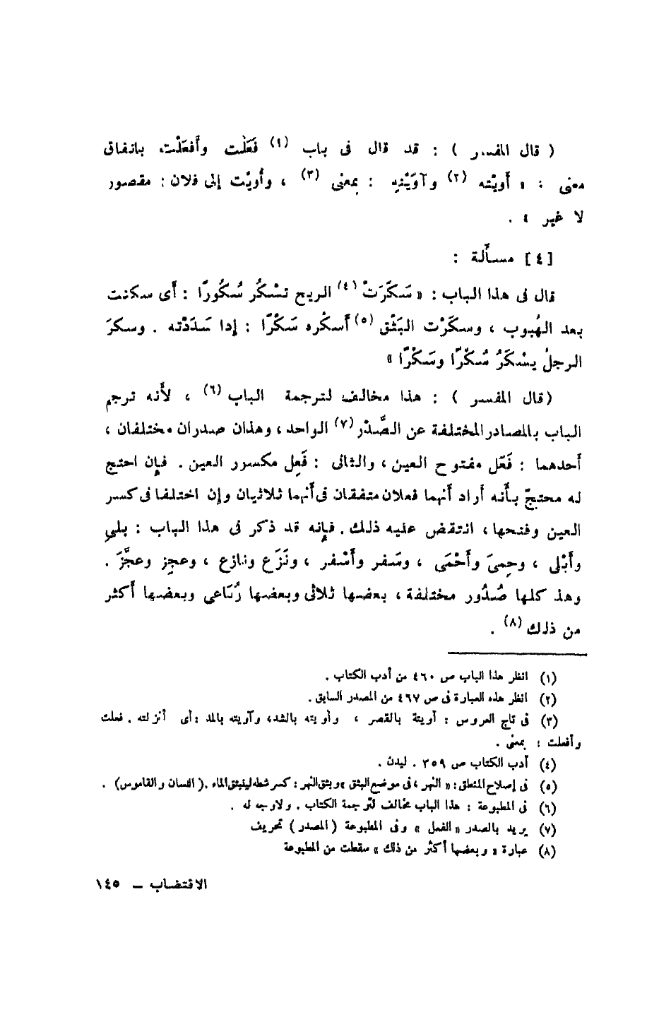(قال المفسر): هذا مخالف لترجمة الباب، لأنه ترجم الباب بالمصادر المختلفة عن الصدر الواحد، وهذان صدران مختلفان، أحدهما: فعل مفتوح العين، والثاني فعل مكسور العين. فإن احتج له محتج بأنه أراد أنهما فعلان متفقان في أنهما ثلاثيان وإن اختلفا في كسر العين وفتحها، انتقض عليه ذلك. فإنه قد ذكر في هذا الباب: بلى وأبلى، وحمى وأحمى، وسفر وأسفر، ونزع ونازع، وعجز وعجز. وهذه كلها صدور مختلفة، بعضها ثلاثي وبعضها رباعي وبعضها أكثر من ذلك.