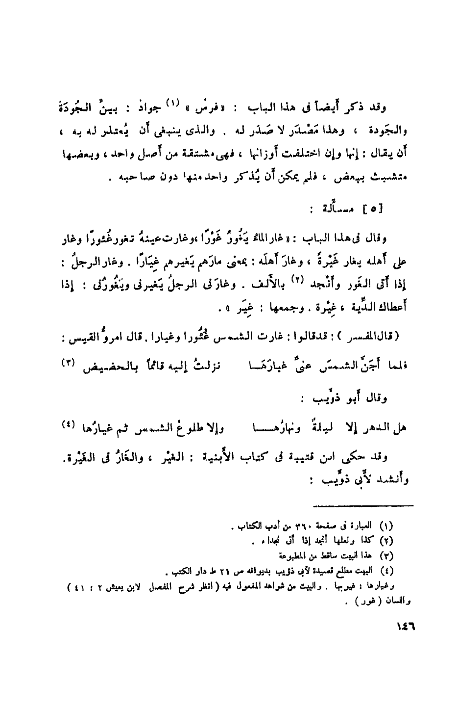 وقد ذكر أيضاً في هذا الباب: "فرس" جواد: بين الجودة والجودة، وهذا مصدر لا صدر له. والذي ينبغي أن يعتذر له به، أن يقال: إنها وإن اختلفت أوزانها، فهي مشتقة من أصل واحد، وبعضها متشبث ببعض، فلم يمكن أن يُذكر واحد منها دون صاحبه.