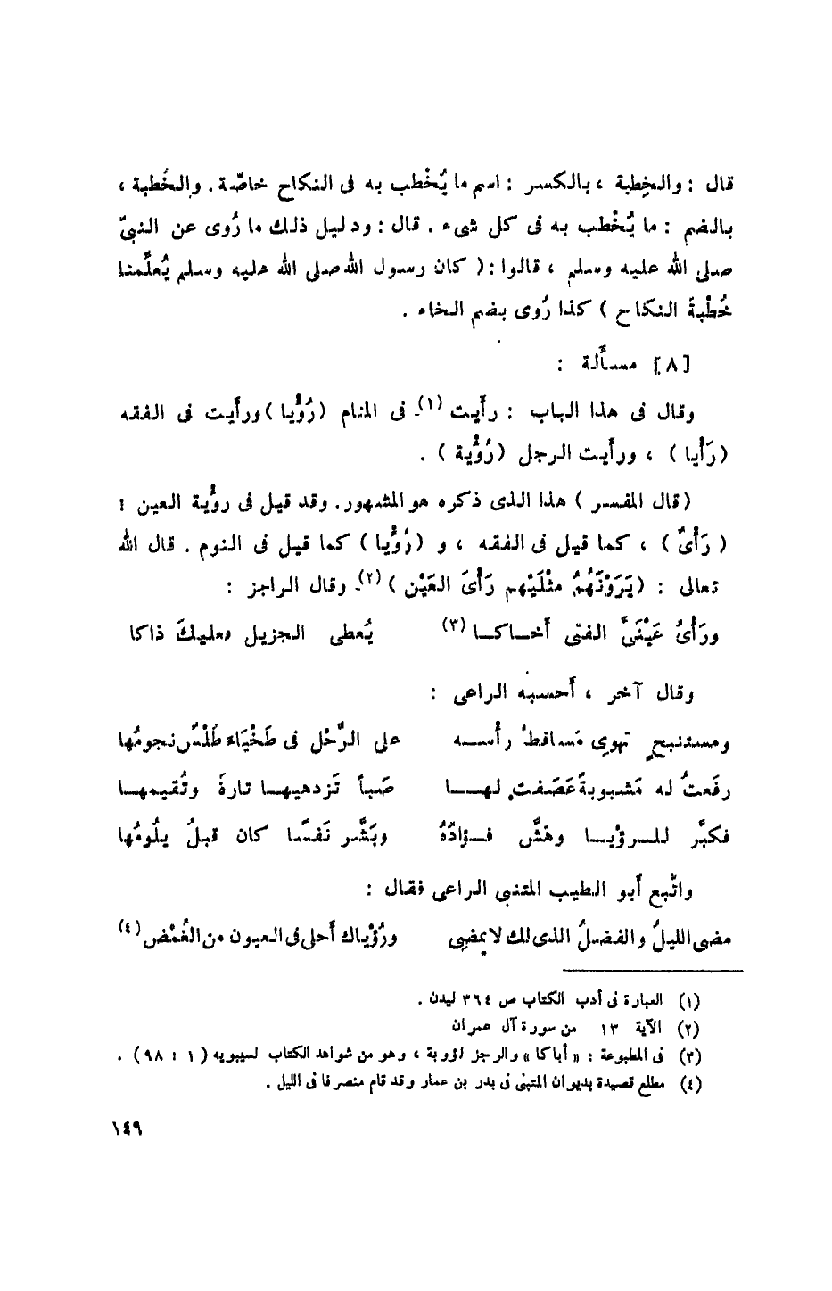 (قال المفسر): هذا الذي ذكره هو المشهور. وقد قيل في رؤية العين، (رأى)، كما قيل في الفقه، و (رؤيا) كما قيل في النوم. قال الله تعالى: (يرونهم مثليهم رأي العين) وقال الراجز: