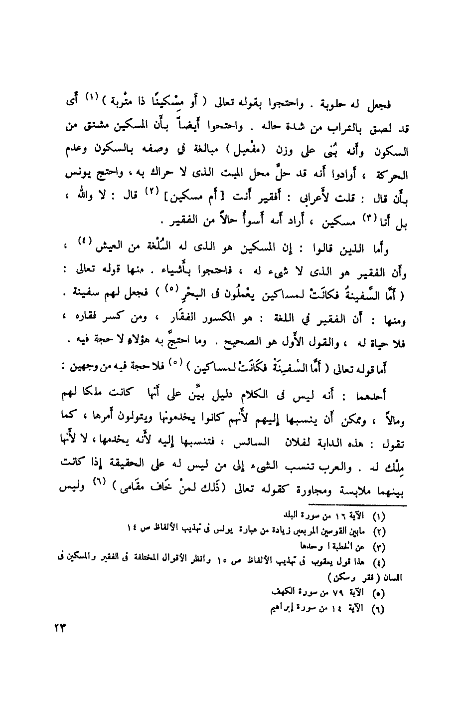 وأما الذين قالوا: إن المسكين هو الذي له السُلغة من العيش، وأن الفقير هو الذي لا شيء له، فاحتجوا بأشياء. منها قوله تعالى: (أما السفينة فكانت لمساكين يعملون في البحر) فجعل لهم سفينة. ومنها: أن الفقير في اللغة: هو المكسور الفقار، ومن كسر فقاره، فلا حياة له، والقول الأول هو الصحيح، وما احتج به هؤلاء لا حجة فيه.