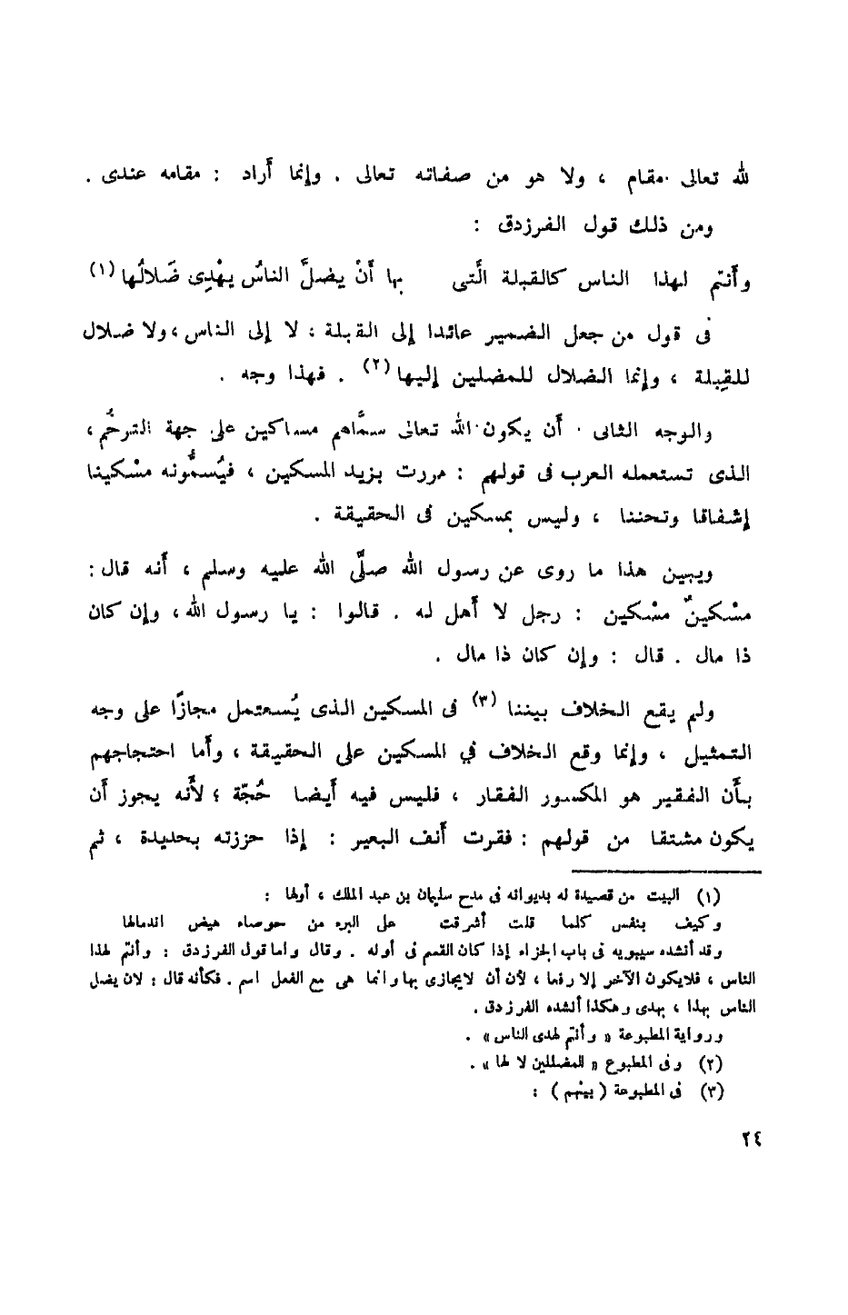 ولم يقع الخلاف بيننا في المسكين الذي يستعمل مجازاً على وجه التمثيل، وإنما وقع الخلاف في المسكين على الحقيقة، وأما احتجاجهم بأن الفقير هو المكسور الفقار، فليس فيه أيضاً حجة؛ لأنه يجوز أن يكون مشتقاً من قوله: فقرت أنف البعير: إذا حززته بحديدة، ثم