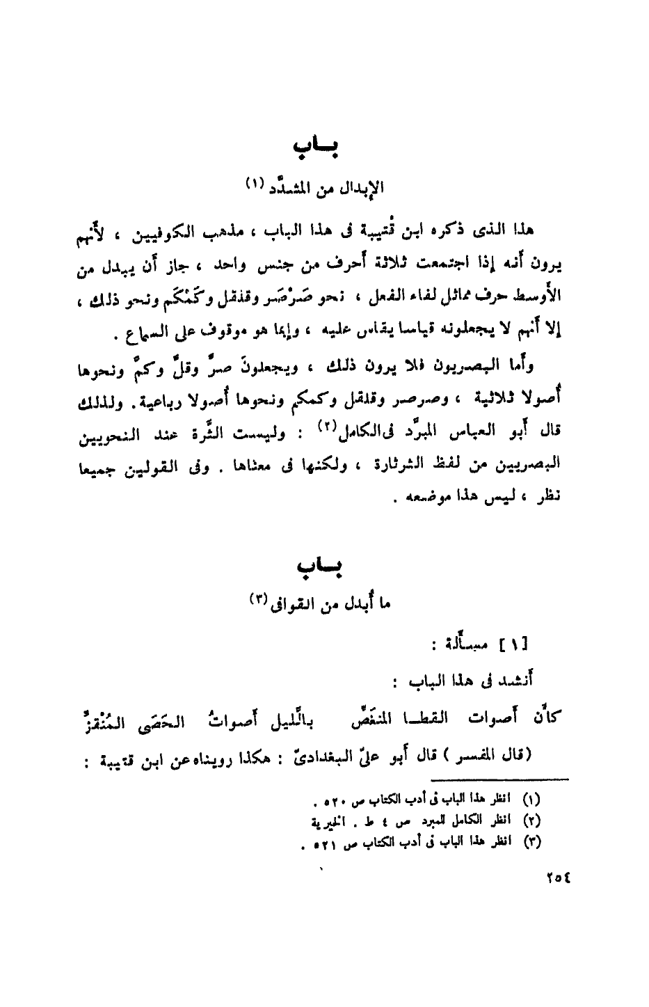 وأما البصريون فلا يرون ذلك، ويجعلون صر وقل وكم ونحوها أصولاً ثلاثية، وصرصر وقلقل وكمكم ونحوها أصولاً رباعية. ولذلك قال أبو العباس المبرد في الكامل: وليست الثرة عند النحويين البصريين من لفظ الثرثارة، ولكنها في معناها. وفي القولين جميعاً نظر، ليس هذا موضعه.