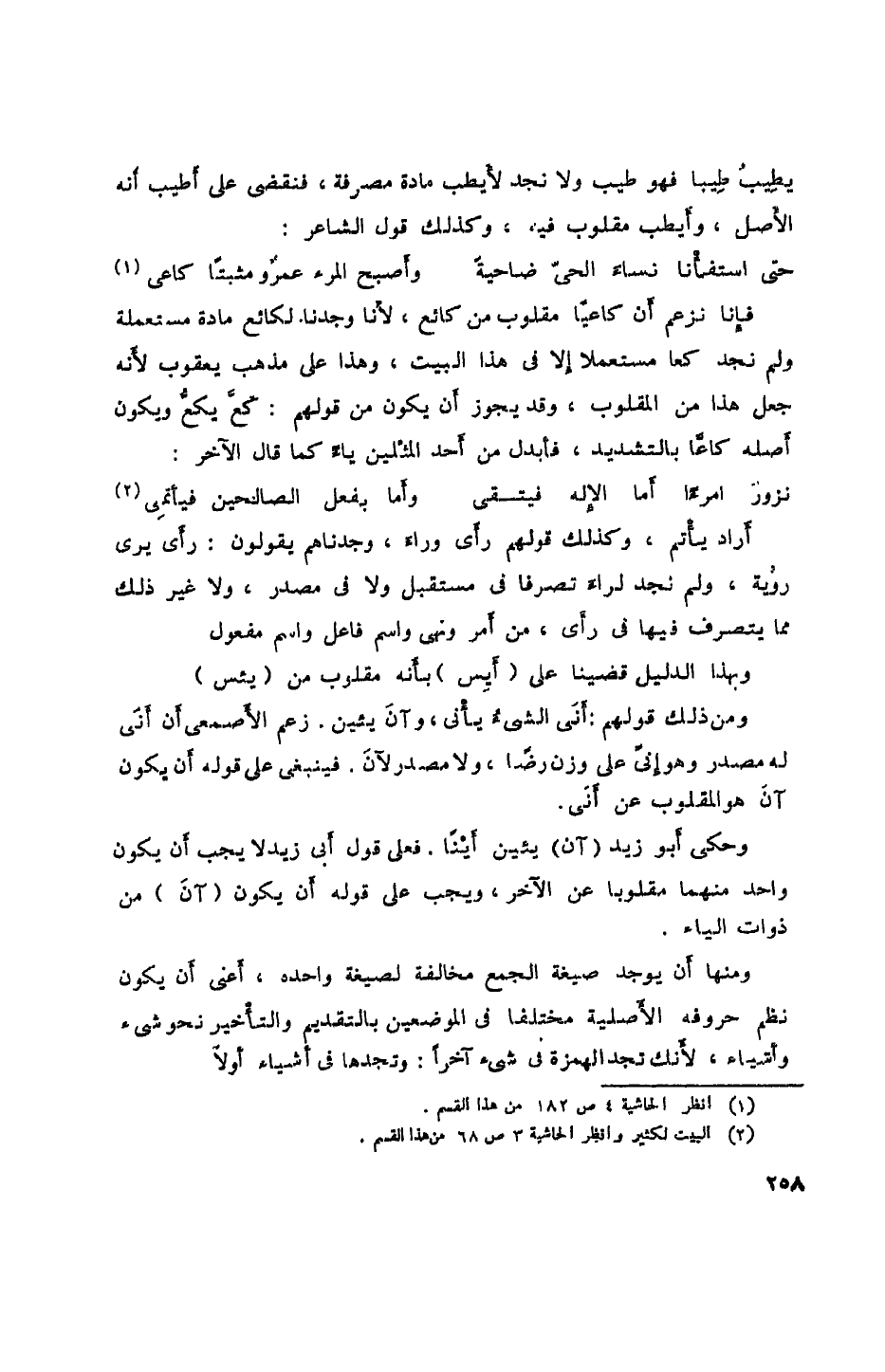 يطيب طيبا فهو طيب ولا نجد لأيطب مادة مصرفة، فنقضي على أطيب أنه الأصل، وأيطب مقلوب فيه، وكذلك قول الشاعر: