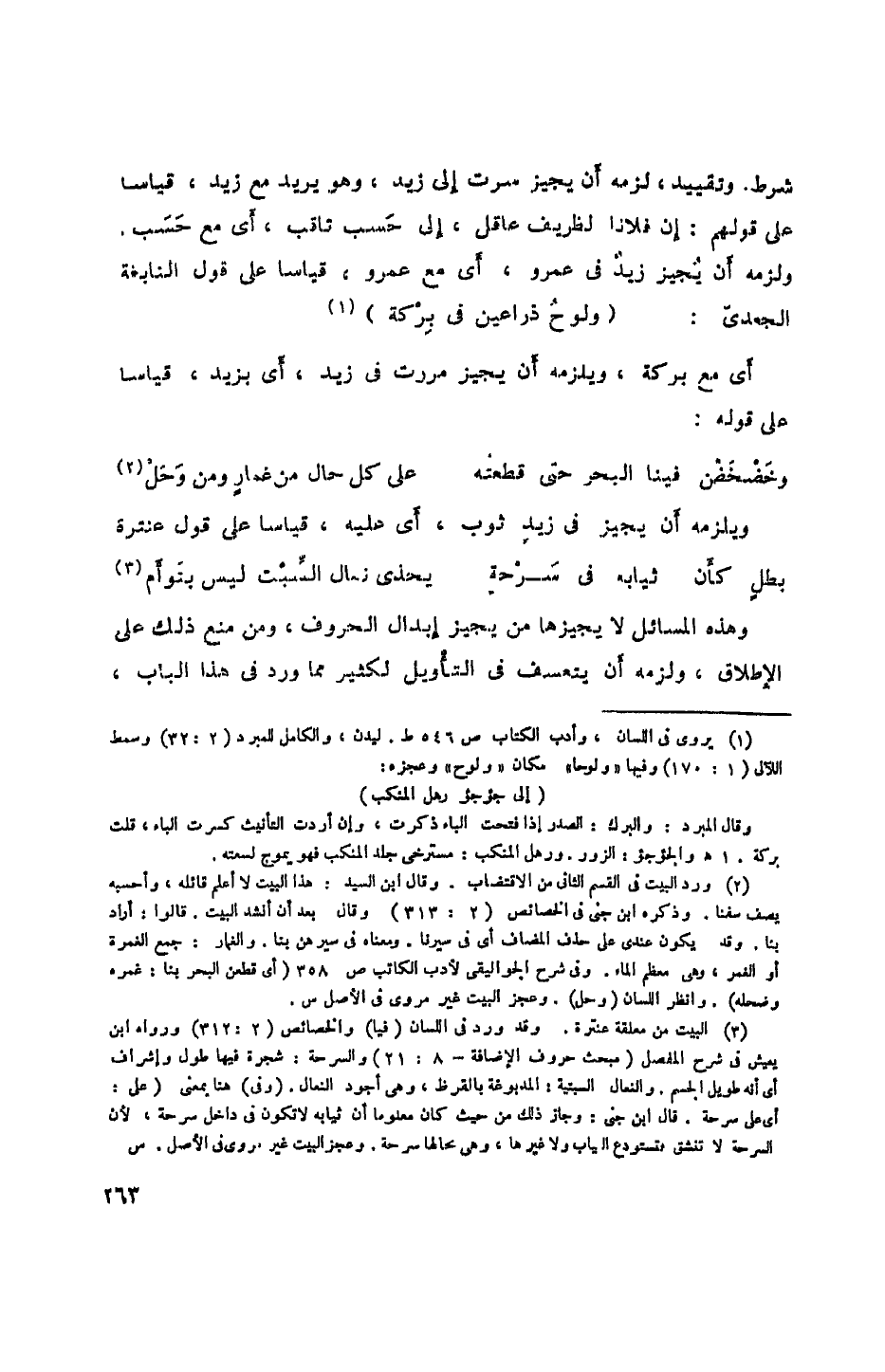 شرط وتقييد، لزمه أن يجيز سرت إلى زيد، وهو يريد مع زيد، قياساً على قولهم: إن فلاناً لظريف عاقل، إلى حسب ثاقب، أي مع حسب، ولزمه أن يجيز زيد في عمرو، أي مع عمرو، قياساً على قول النابغة الجعدي: (ولوح ذراعين في بركة)