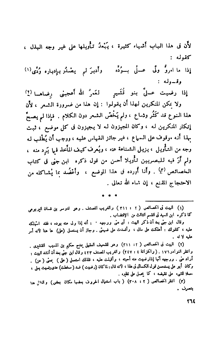 ولا يمكن المنكرين لهذا أن يقولوا: إن هذا من ضرورة الشعر، لأن هذا النوع قد كثر وشاع، ولم يخص الشعر دون الكلام. فإذا لم يصح إنكار المنكرين له، وكان المجيزون له لا يجيزون في كل موضع، ثبت بهذا أنه موقوف على السماع، غير جائز القياس عليه، ووجب أن يطلب له وجه من التويل، يزيل الشناعة عنه، ويعرف كيف المأخذ فيما يرد منه، ولم أر فيه للبصريين تأويلا أحسن من قول ذكره ابن جني في كتاب الخصائص. وأنا أورده في هذا الموضع، وأعضد بما يشاكله من الاحتجاج المقنع، إن شاء الله تعالى.