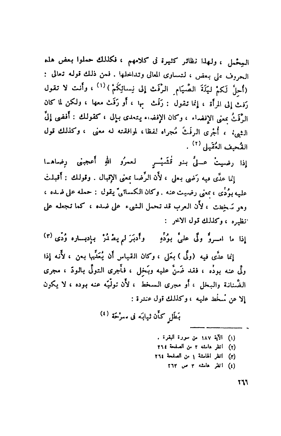 المحمل، ولهذا نظائر كثيرة في كلامهم، فكذلك حملوا بعض هذه الحروف على بعض، لتساوي المعاني وتداخلها. فمن ذلك قوله تعالى: (أحل لكم ليلة الصيام الرفث إلى نسائكم)، وأنت لا تقول رفث إلى المرأة، إنما تقول: رفث بها، أو رفث معها، ولكن لما كان الرفث بمعنى الإفضاء، وكان الإفضاء يتعدى بإلى، كقولك: أفضى إلى الشيء، أجرى الرفث مجراها لفظا، لموافقته له معنى، وكذلك قول القحيف العقيلي.