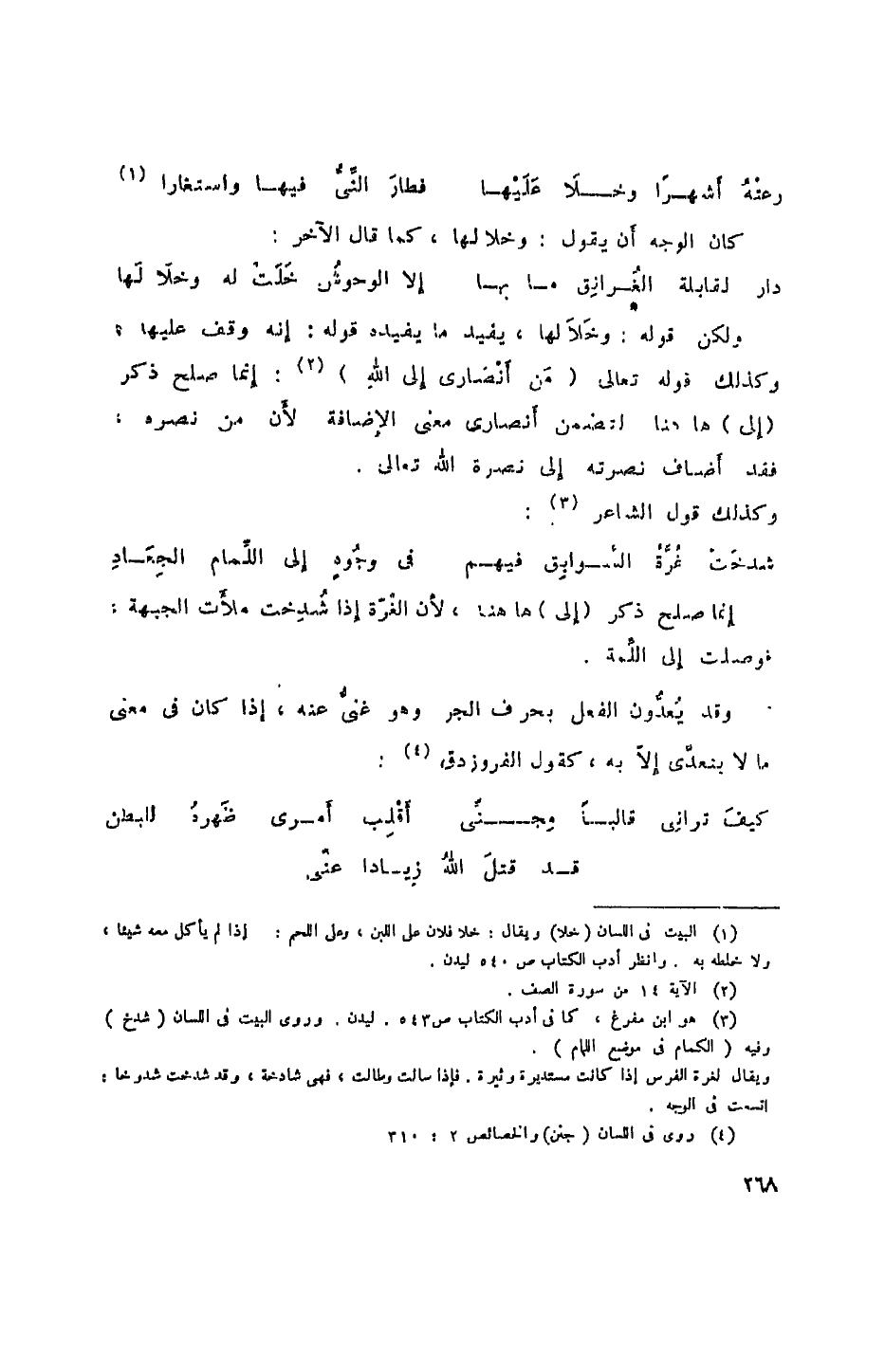 ولكن قوله: وخلالها، يفيد ما يفيده قوله: إنه وقف عليها وكذلك قوله تعالى (من أنصارى إلى الله): إنما صلح ذكر (إلى) هاهنا لتضمن أنصارى معنى الإضافة لأن من نصره، فقد أضاف نصرته إلى نصرة الله تعالى.