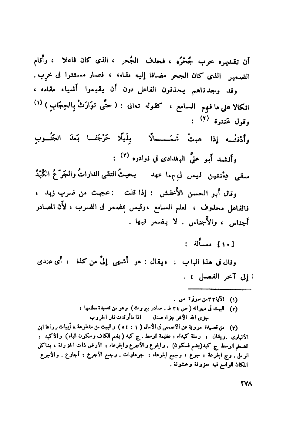 وقد وجدناهم يحذفون الفاعل دون أن يقيموا أشياء مقامه، اتكالاً على ما فهم السامع، كقوله تعالى: (حتى توارث بالحجاب) وقول عنترة: