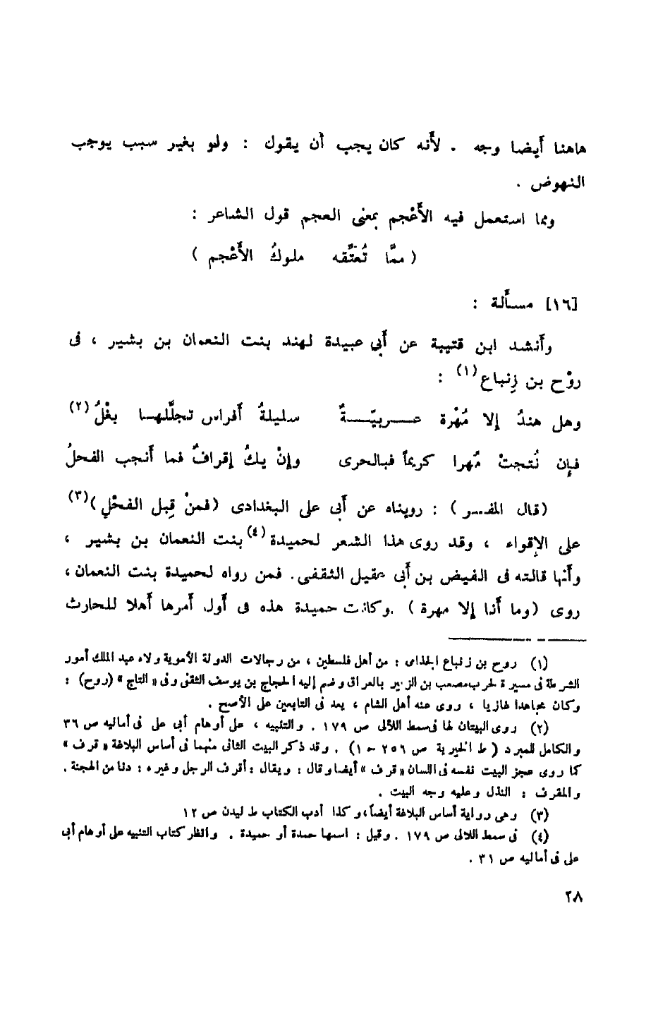 (قال المفسر): رويناه عن أبي على البغدادي (فمن قبل الفحل) على الإقواء، وقد روى هذا الشعر لحميدة بنت النعمان بن بشير، وأنها قالته في الفيض بن أبي عقيل الشقفي. فمن رواه لحميدة بنت النعمان، روى (وما أنا إلا مهرة). وكانت حميدة هذه في أول أمرها أهلا للحارث