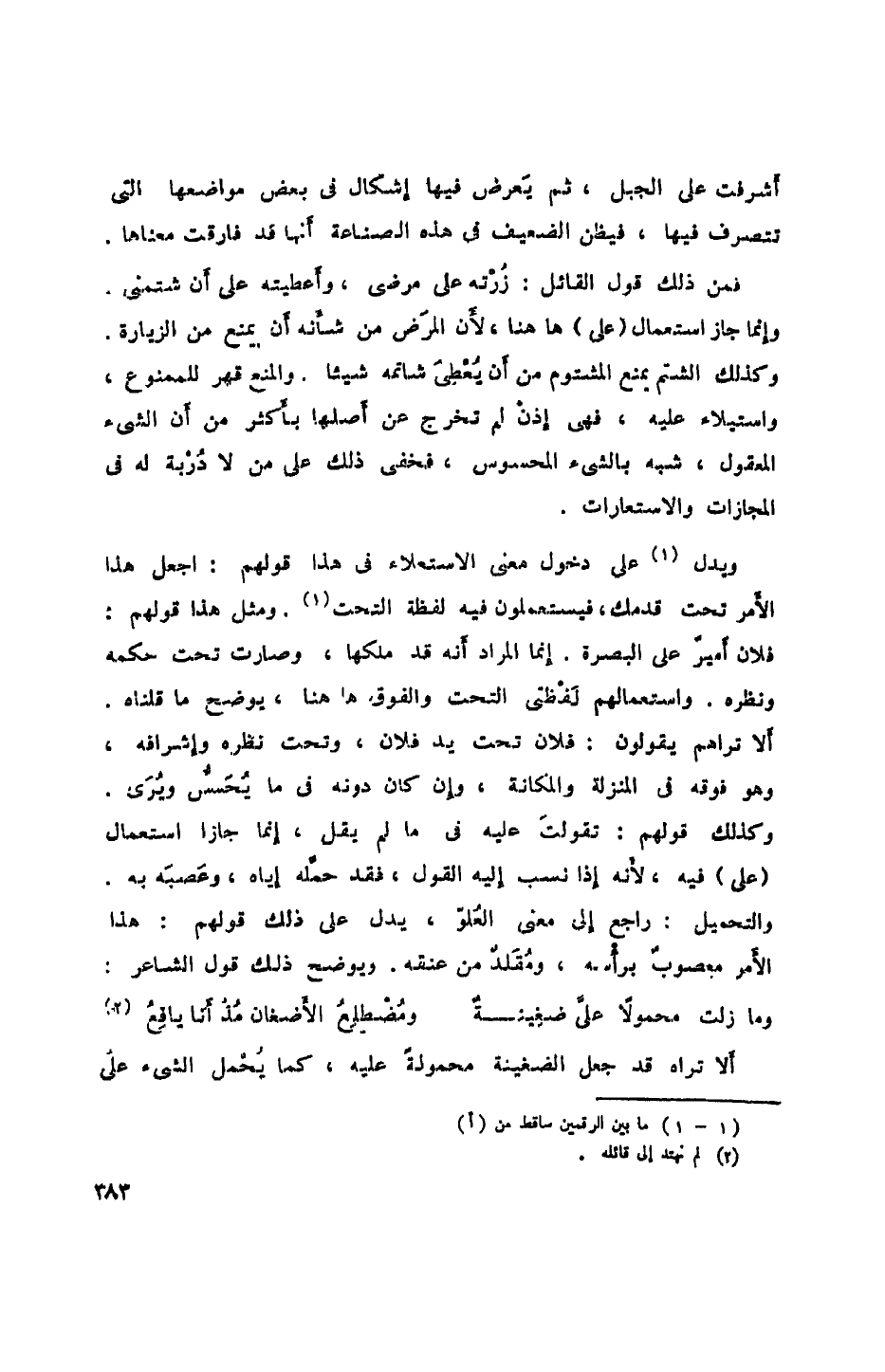 ويدل على دخول معنى الاستعلاء في هذا قولهم اجعل هذا الأمر تحت قدمك، فيستعملون فيه لفظة التحت. ومثل هذا قولهم: فلان أمير على البصرة. إنما المراد أنه قد ملكها، وصارت تحت حكمه ونظره. واستعمالهم لفظتي التحت والفوق هاهنا، يوضح ما قلناه. ألا تراهم يقولون: فلان تحت يد فلان، وتحت نظره وإشرافه، وهو فوقه في المنزلة والمكانة، وإن كان دونه في ما يحسس ويرى. وكذلك قولهم: تقولت عليه في ما لم يقل، إنما جازا استعمال (على) فيه، لأنه إذا نسب إليه القول، فقد حمله إياه، وعصبه به. والتحميل: راجع إلى معنى العلو، يدل على ذلك قولهم: هذا الأمر معصوب برأسه، ومقلد من عنقه. ويوضح ذلك قول الشاعر: