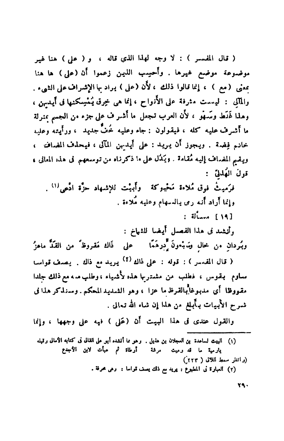 (قال المفسر): لا وجه لهذا الذي قاله، و (على) هنا غير موضوعة موضع غيرها. وأحسب الذين زعموا أن (على) هاهنا بمعنى (مع)، إنما قالوا ذلك، لأن (على) يراد بها الإشراف على الشيء. والمآلي: ليست مشرفة على الأنواح، إنما هي خرق يمسكنها في أيديهن، وهذا غلط وسهو، لأن العرب تجعل ما أشرف على جزء من الجسم بمنزلة ما أشرف عليه كله، فيقولون: جاء وعليه خف جديد، ورأيته وعليه خاتم فضة، ويجوز أن يريد: على أيديهن المآلي، فيحذف المضاف، ويقيم المضاف إليه مقامة، ويدل على ما ذكرناه من توسعهم في هذه المعاني، قول الهذلي:
