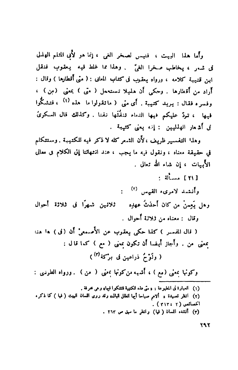 وأما هذا البيت، فليس لصخر الغي، إنما هو لأبي المثلم الهذلي في شعر، يخاطب صخراً الغي. وهذا مما غلط فيه يعقوب فنقل ابن قتيبة كلامه، ورواه يعقوب في كتاب المعاني: (متى أقطارها) وقال: أراد من أقطارها. وحكى أن هذيلاً تستعمل (متى) بمعنى (من)، وفسره فقال: يريد كتيبة. أي متى (ما تقولوا ما هذه، فتشكوا فيها، ترد عليكم فيها الدماء تنفثها نفثاً. وكذلك قال السكري في أشعار الهذليين: إنه يعني كتيبة.