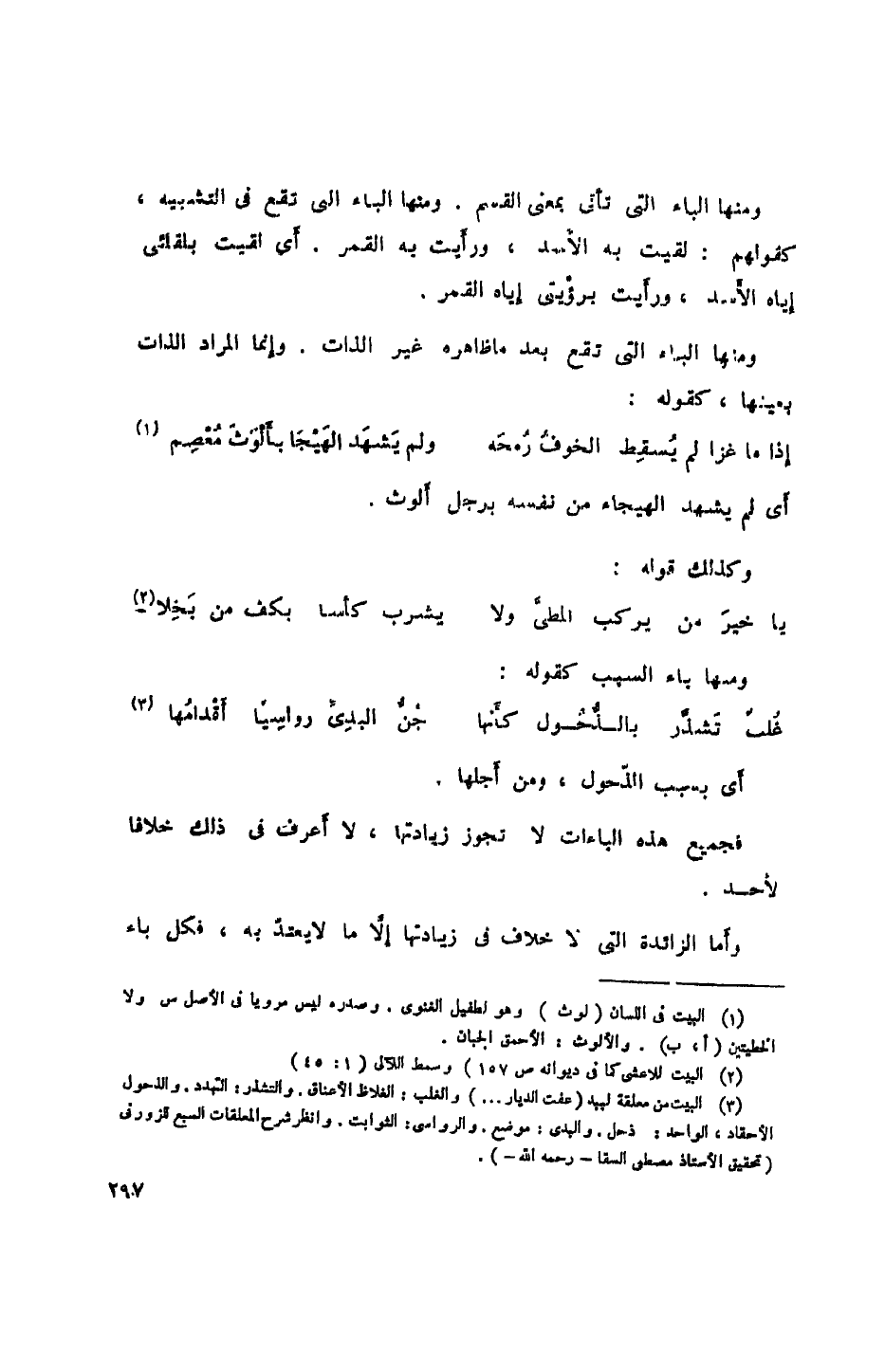 ومنها الباء التي تأتي بمعنى القسم. ومنها الباء التي تقع في التشبيه، كقولهم: لقيت به الأسد، ورأيت به القمر، أي لقيت بلقائي إياه الأسد، ورأيت برؤيتي إياه القمر.