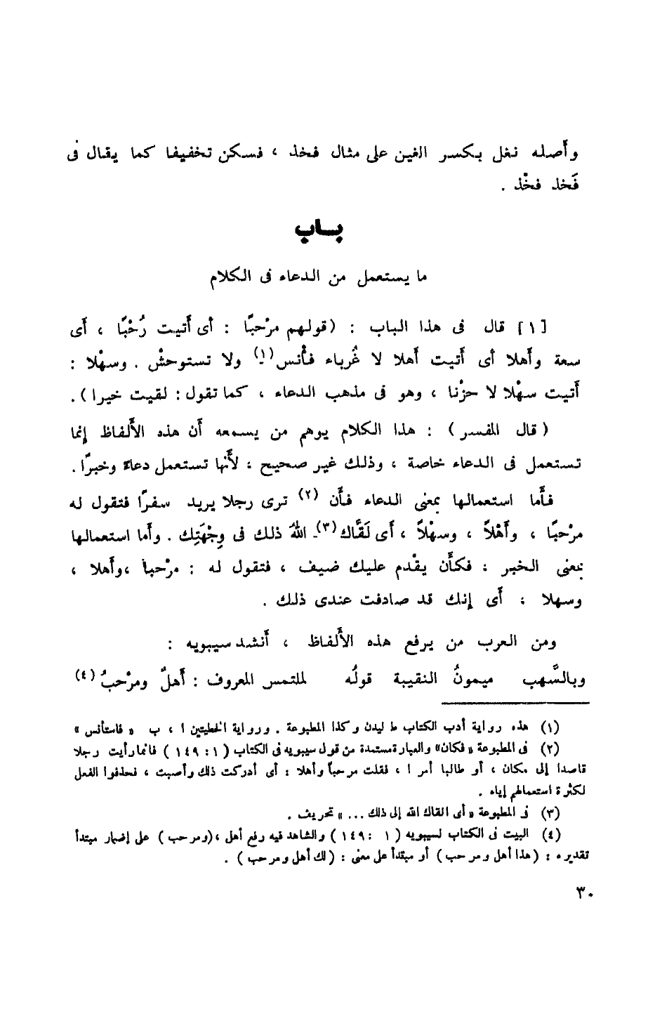 [1] قال في هذا الباب: (قولهم مرحباً: أي أتيت رحباً، أي سعة وأهلاً أي أتيت أهلاً لا غُرباء فانس ولا تستوحش. وسهلاً: أتيت سهلاً لا حزنا، وهو في مذهب الدعاء، كما تقول: لقيت خيراً).