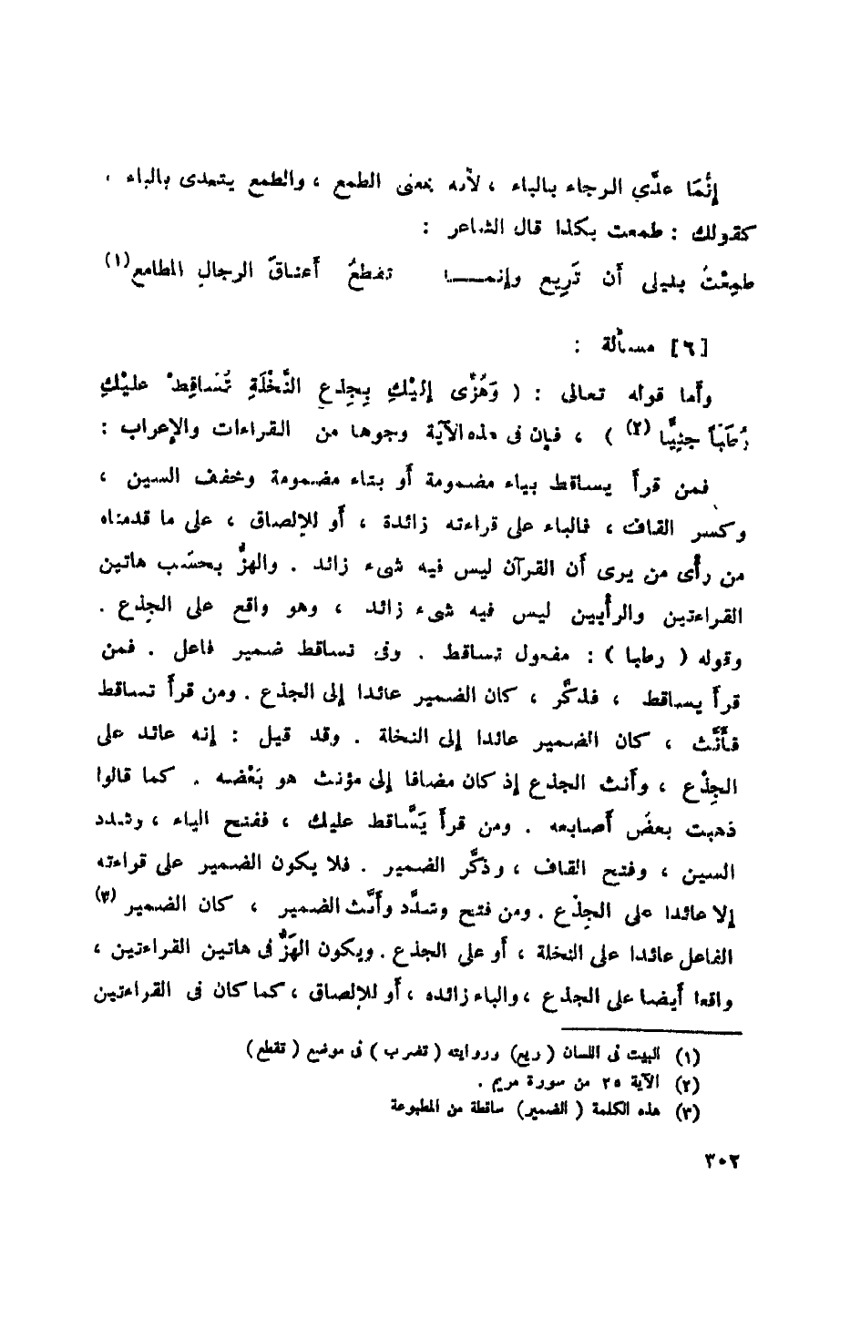 وأما قوله تعالى: (وهزى إليك بجذع النخلة تساقط عليك رطباً جنياً)، فإن في هذه الآية وجوهاً من القراءات والإعراب: فمن قرأ يساقط بباء مضمومة أو بتاء مضمومة وخفف السين، وكسر القاف، فالباء على قراءته زائدة، أو للإلصاق، على ما قدمناه من رأى من يرى أن القرآن ليس فيه شيء زائد. والهز بحسب هاتين القراءتين والرأيين ليس فيه شيء زائد، وهو واقع على الجذع. وقوله (رطباً): مفعول تساقط، وفي تساقط ضمير فاعل، فمن قرأ يساقط، فذكر، كان الضمير عائداً إلى الجذع. ومن قرأ تساقط فأنث، كان الضمير عائداً إلى النخلة. وقد قيل: إنه عائد على الجذع، وأنث الجذع إذ كان مضافاً على مؤنث هو بعضه. كما قالوا ذهبت بعض أصابعه. ومن قرأ يساقط عليك، ففتح الياء، وشدد السين، وفتح القاف، وذكر الضمير. فلا يكون الضمير على قراءته إلا عائداً على الجذع. ومن فتح وشدد وأنث الضمير، كانالضمير الفاعل عائداً على النخلة، أو على الجذع، ويكون الهز في هاتين القراتين، واقعاً أيضاً على الجذع، والباء زائدة، أو للإلصاق، كما كان في القراءتين