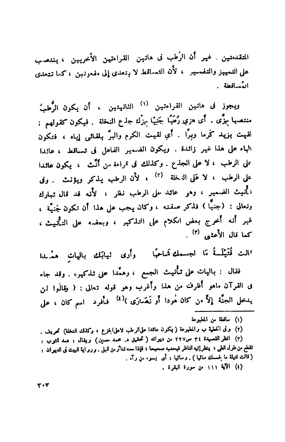 ويجوز في هاتين القراءتين الثانيتين، أن يكون الرطب منتصباً بهزي، أي هزي رطباً جنياً بهزك جذع النخلة. فيكون كقولهم: لقيت بزيد كرماً وبراً. أي لقيت الكرم والبر بلقائي إياه، فتكون الباء على هذا غير زائدة. ويكون الضمير الفاعل في تساقط، عائداً على الرطب، لا على الجذع. وكذلك في قراءة من أنث، يكون عائداً على الرطب، لا على النخلة، لأن الرطب يذكر ويؤنث. وفي تأنيث الضمير، وهو عائد على الرطب نظر، لأنه قد قال تبارك وتعالى: (جنيا) فذكر صفته، وكان يجب على هذا أن تكون جنية، غير أنه أخرج بعض الكلام على التذكير، وبعضه على التأنيث، كما قال الأعشى: