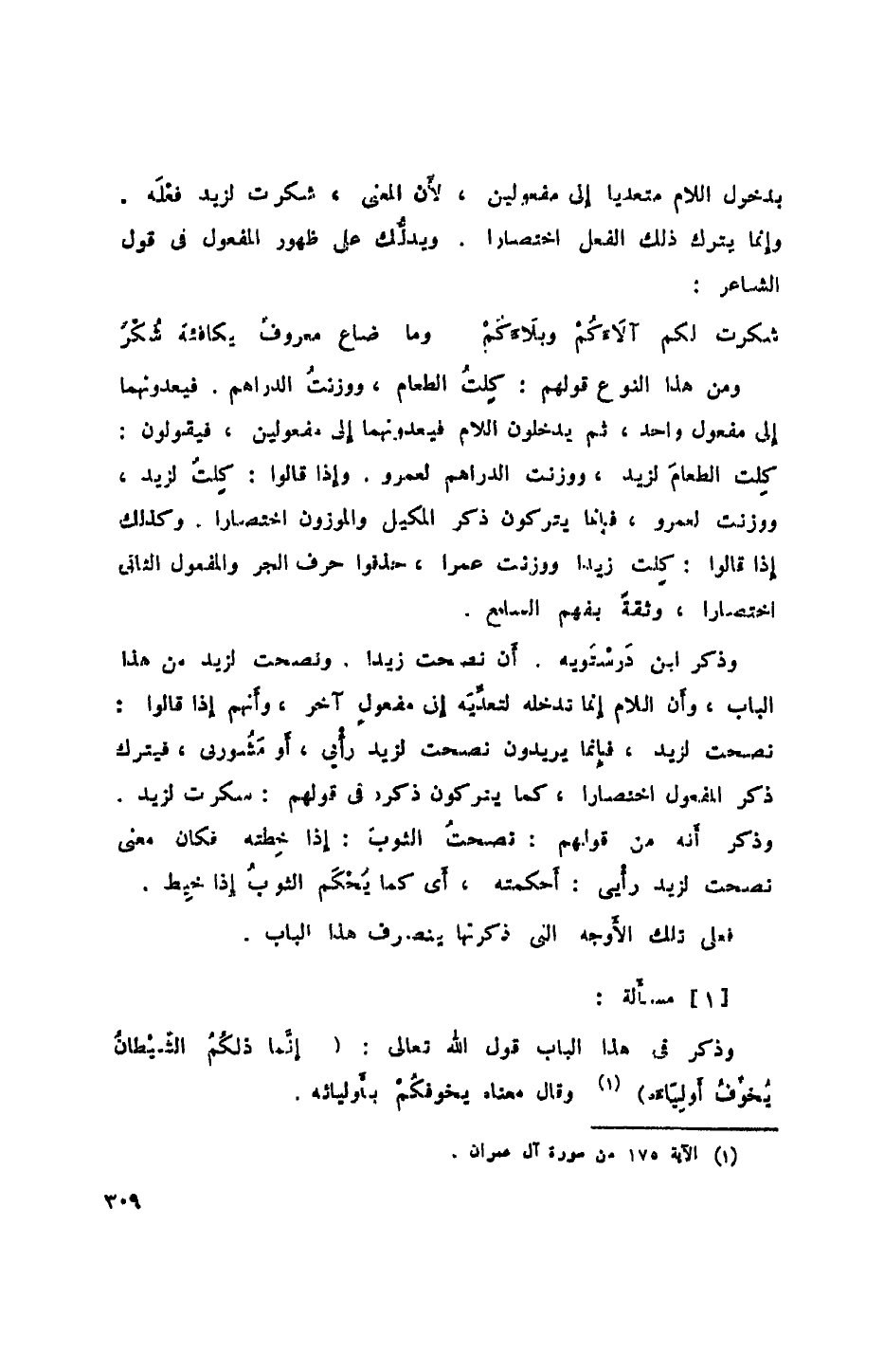 بدخول اللام متعدياً إلى مفعولين، لأن المعنى، شكرت لزيد فعله. وإنما يترك ذلك الفعل اختصاراً. ويدلك على ظهور المفعول في قول الشاعر: