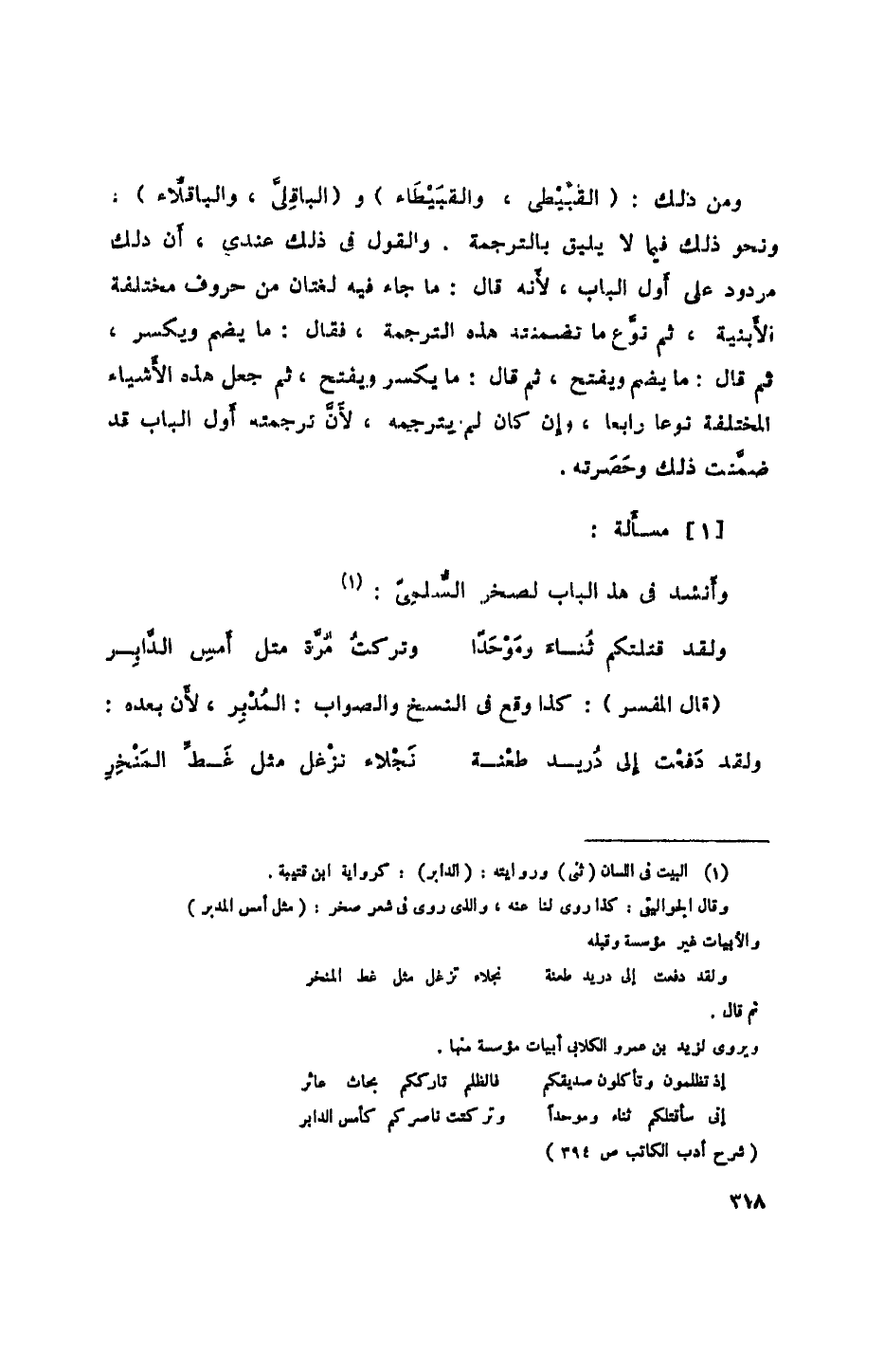 ومن ذلك: (القبيطي، والقبيطاء) و (الباقلي، والباقلاء)، ونحو ذلك فيما لا يليق بالترجمة. والقول في ذلك عندي، أن ذلك مردود على ألو الباب، لأه قال: ما جاء فيه لغتان من حروف مختلفة الأبنية، ثم نوع ما تضمنته هذه الترجمة، فقال: ما يضم ويكسر، ثم قال: ما يضم ويفتح، ثم قال: ما يسر ويفتح، ثم جعل هذه الأشياء المختلفة نوعاً رابعاً، وإن كان لم يترجمه، لأن ترجمته أول الباب قد ضمنت ذلك وحصرته.