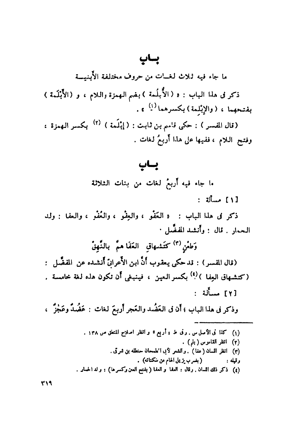 (قال المفسر): قد حكى يعقوب ن ابن الأعرابي أنشده عن المفضل: (كتشهاق العفا) بكسر العين، فينبغي أن تكون هذه لغة خامسة.