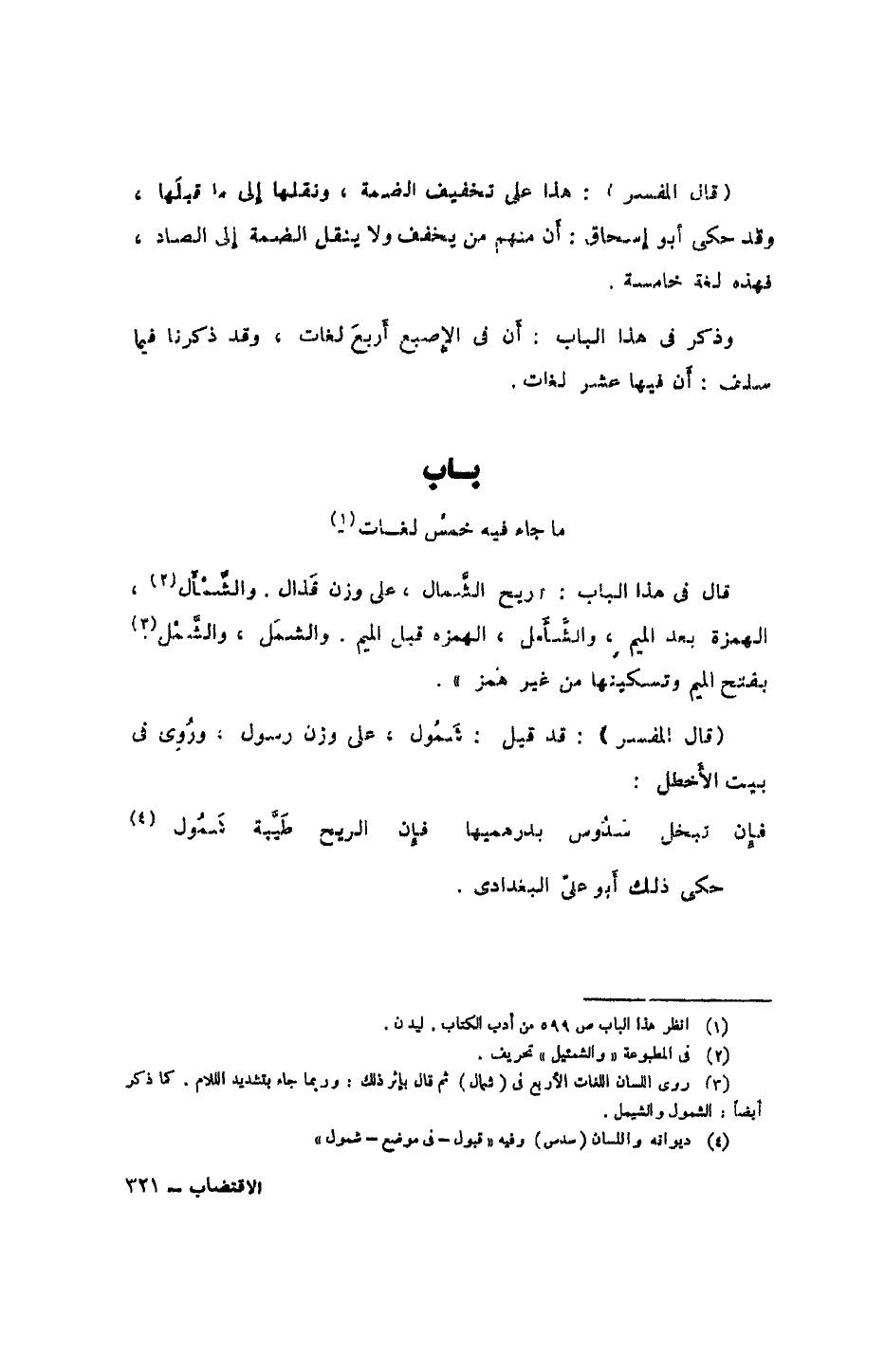 قال في هذا الباب: ريح الشمال، على وزن فذال، والشمأل، الهمزة بعد الميم، والشأمل، الهمزة بعد الميم، والشأمل، الهمزة قبل الميم، والشمل، والشمل بفتح الميم وتسكينها من غير همز".