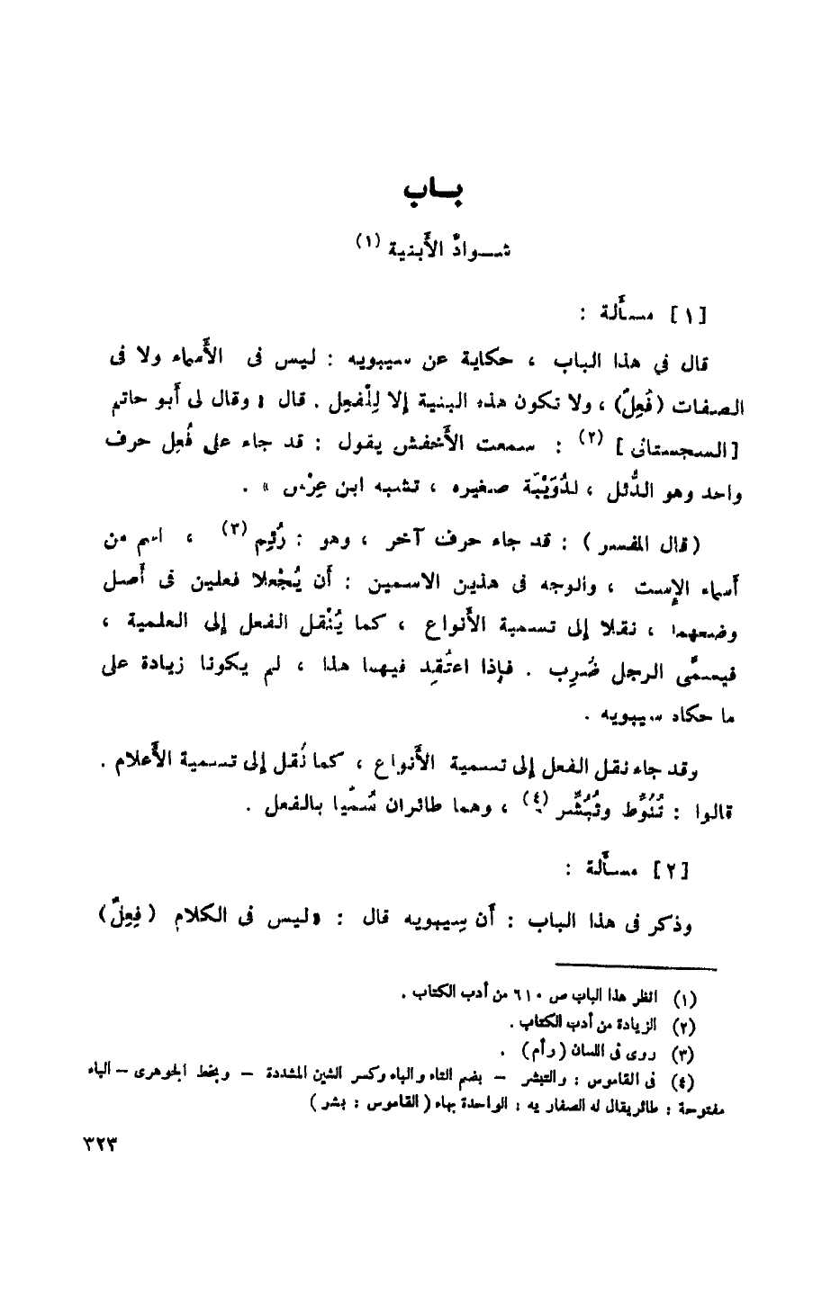 (قال المفسر): قد جاء حرف آخر، وهو: رئم، اسم من أسماء الإست، والوجه في هذين الاسمين: أن يجعلا فعلين في أصل وضعهما، نقلا إلى تسمية الأنواع، كما ينقل الفعل إلى العلمية، فيسمى الرجل ضرب، فإذا اعتقد فيهما هذا، لم يكونا زيادة على ما حكاه سيبويه.