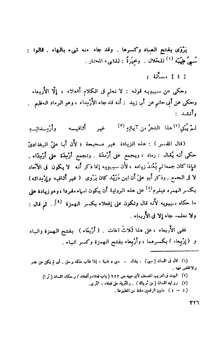 وحكى عن سيبويه قوله: لا نعلم في الكلام أفعلاء، إلا الأربعاء وحكى عن أبي حاتم عن أبي زيد: أنه قدجاء الأرمداء، وهو الرماد العظيم، وأنشد: