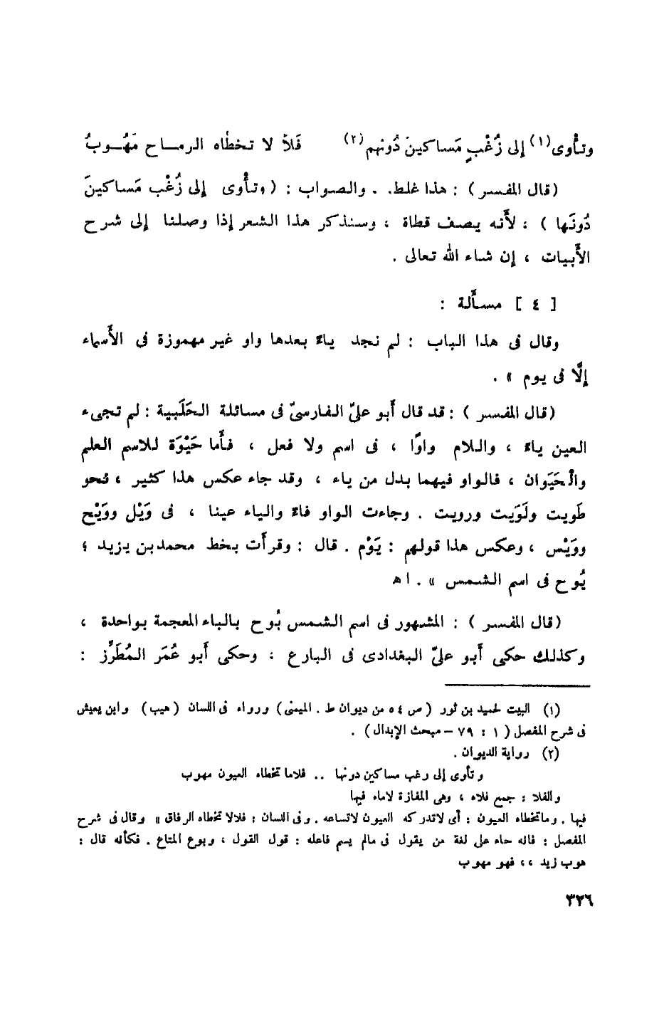 (قال المفسر): قد قال أبو علي الفارسي في مسائلة الحلبية: لم تجيء العين ياء، واللام واواً، في اسم ولا فعل، فأما حيوة للاسم العلم والحيوان، فالواو فيهما بدل من ياء، وقد جاء عكس هذا كثير، نحو طويت ولويت ورويت. وجاءت الواو فاء والياء عينا، في ويل وويح وويسن وعكس هذا قولهم يوم. قال: وقرأت بخط محمد بن يزيد، يوح في اسم الشمس". أهـ.
