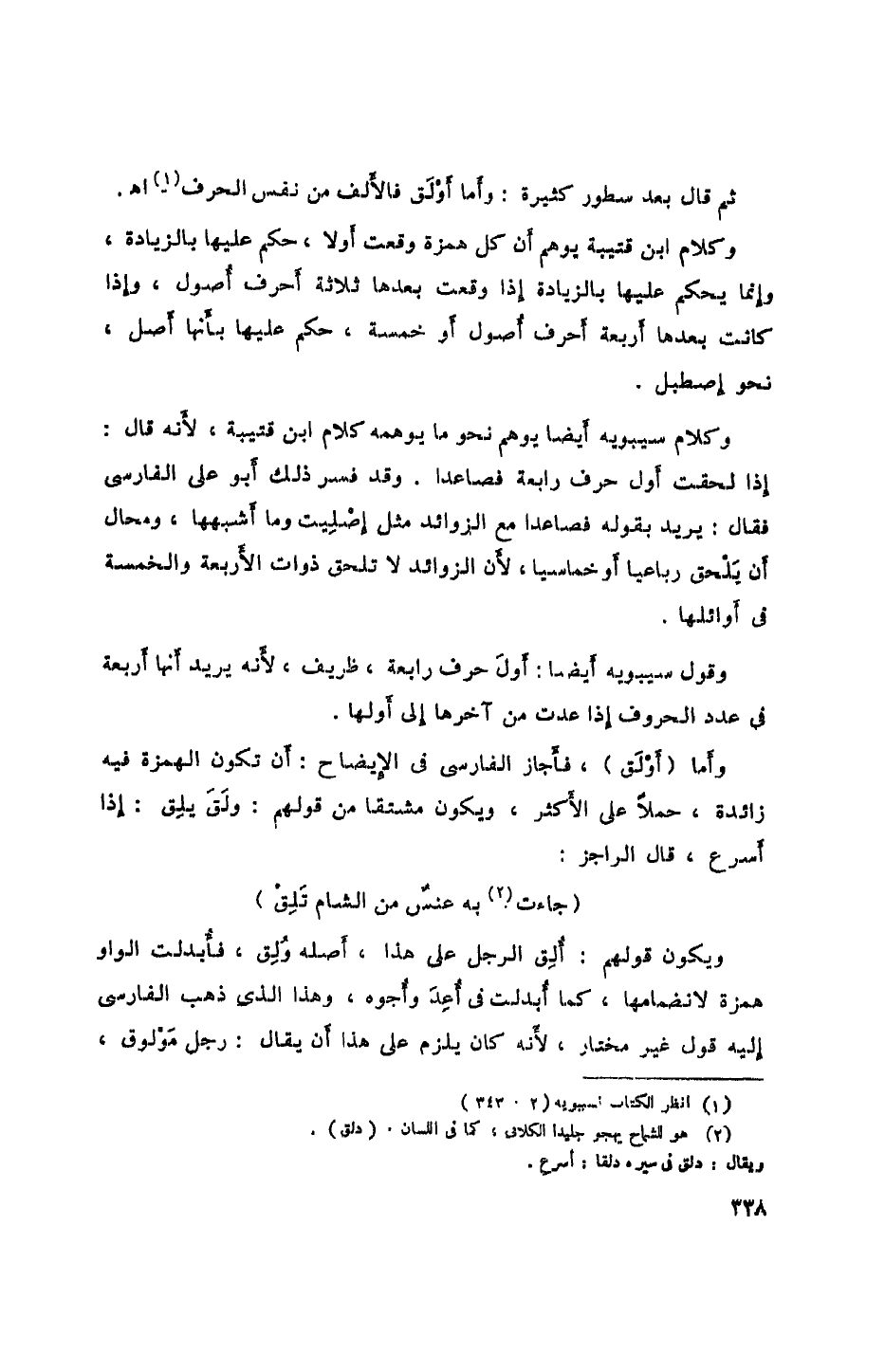 وكلام سيبويه أيضاً يوهم نحو ما يوهمه كلام ابن قتيبة، لأنه قال: إذا لحقت أول حرف رابعة فصاعداً. وقد فسر ذلك أبو علي الفارسي فقال: يريد بقوله فصاعداً مع الزواد مثل إصليت وما أشبهها، ومحال أن يلحق رباعياً أو خماسياً، لأن الزوائد لا تلحق ذوات الأربعة والخمسة في أوائلها.
